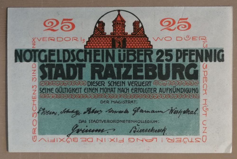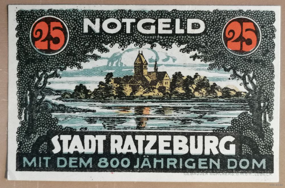 Германия, нотгельды, 25 пфеннигов 1921год, Ратцебург (Ratzeburg), (95 х 61 мм)