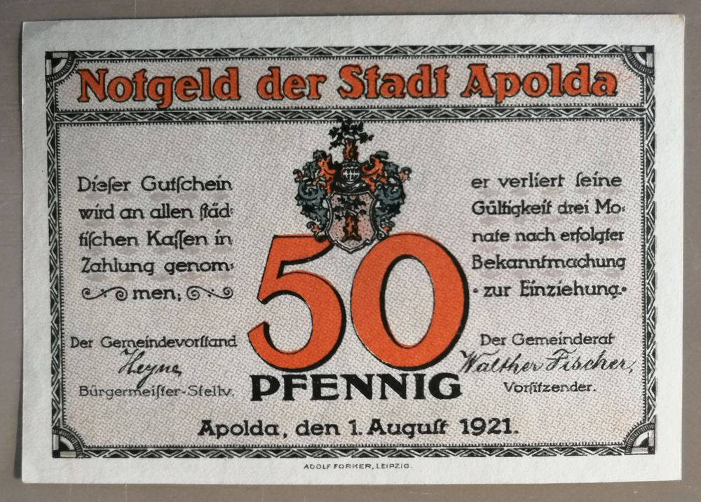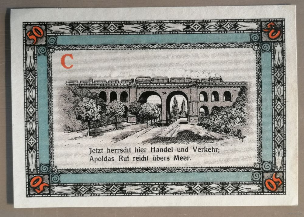 Германия, нотгельды, 50 пфеннигов 1921год, Апольда (Apolda), 36.3a, вар. "С", (100 х 70 мм)