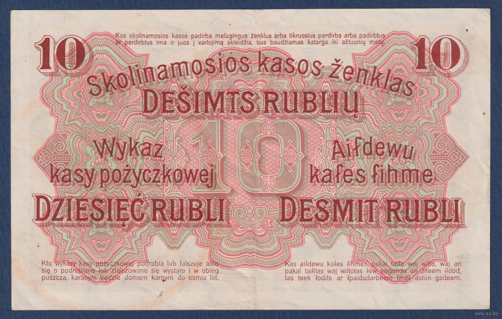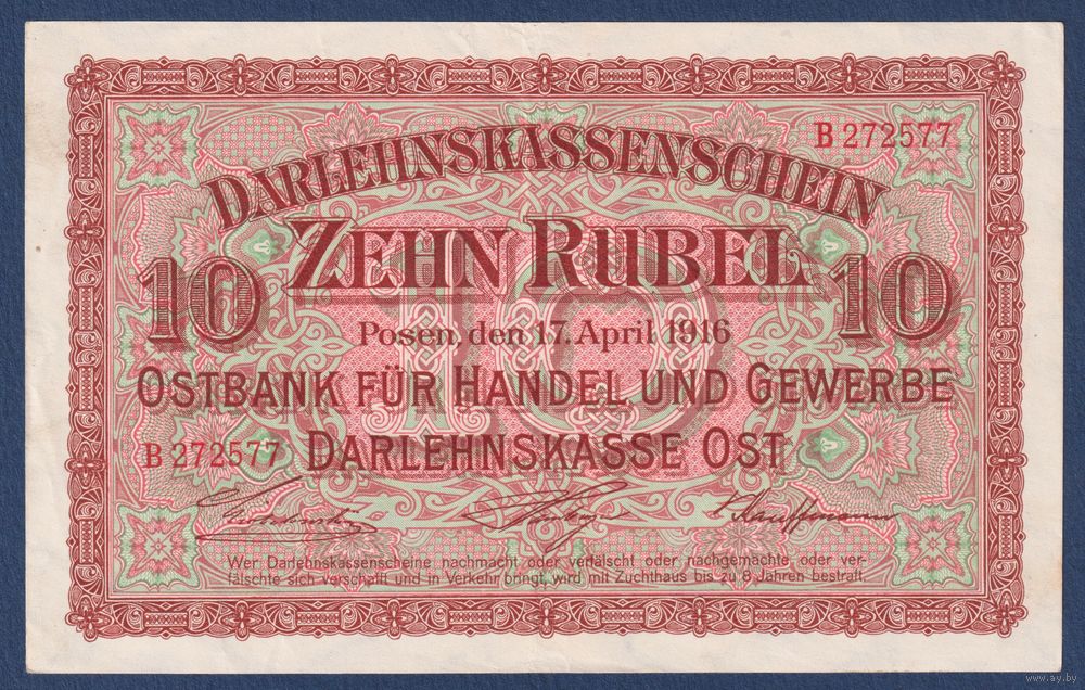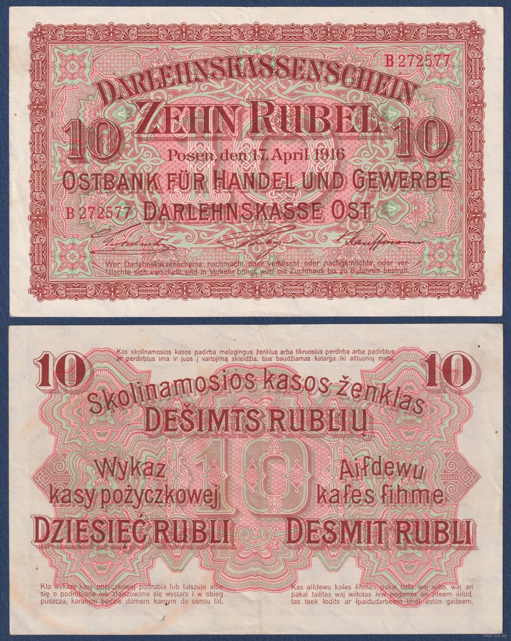 Германия (Познань), 10 рублей 1916 г, P-R124 (B, 1-ая мировая, немецкая оккупация), XF-