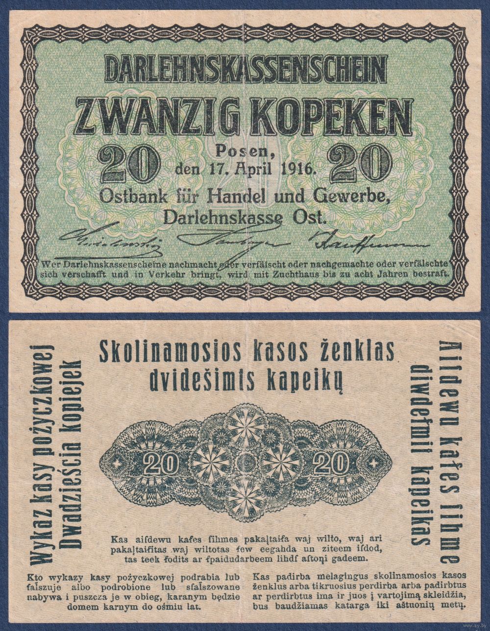 Германия (Познань), 20 копеек 1916 г, P-R120 (1-ая мировая, немецкая оккупация), XF