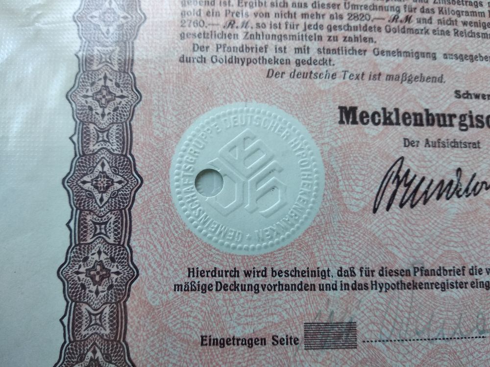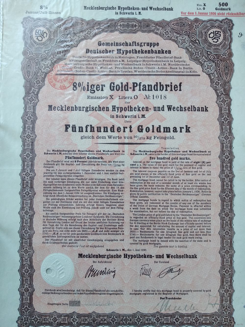 Германия, Шверин 1930, Ипотечная Облигация, 500 Голдмарок -8%, Водяные знаки, Тиснение. Размер - А4