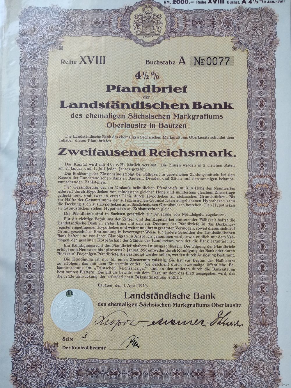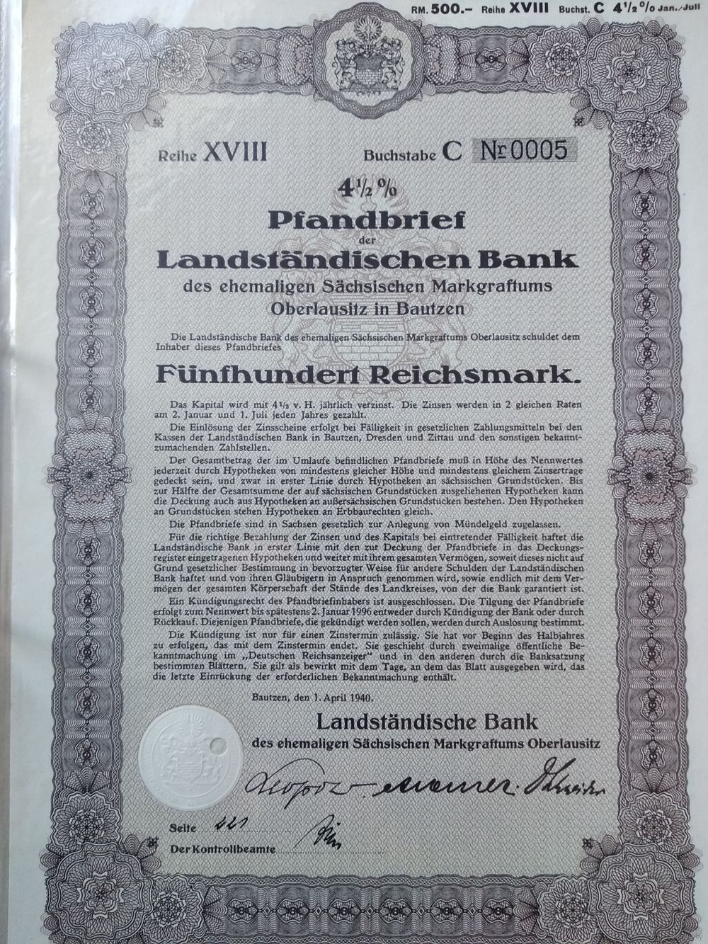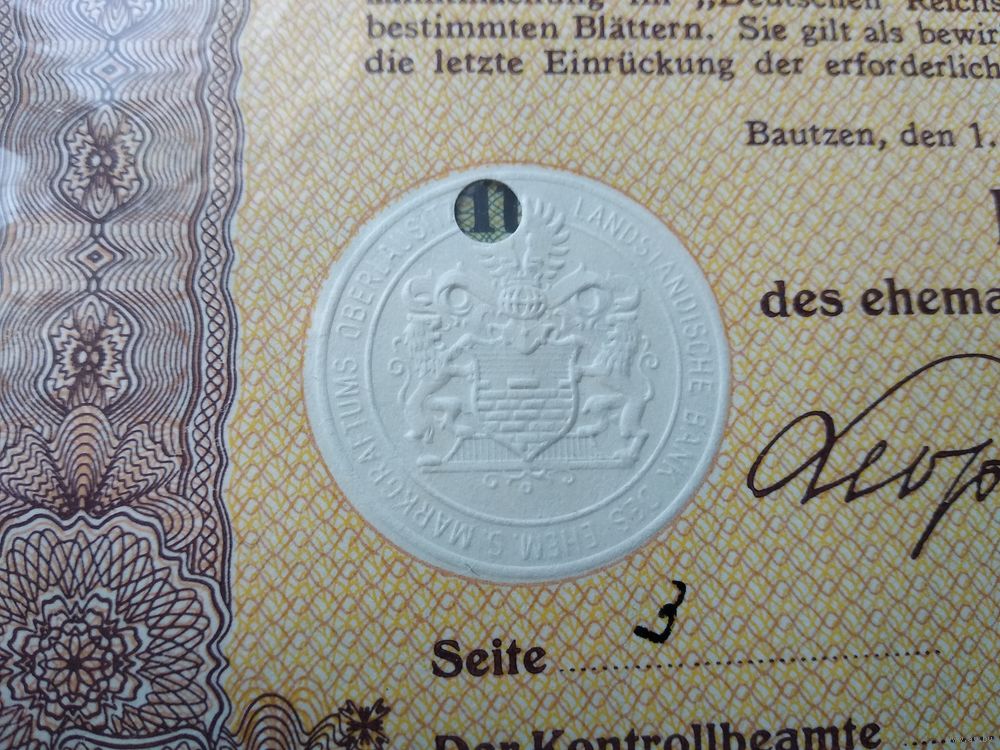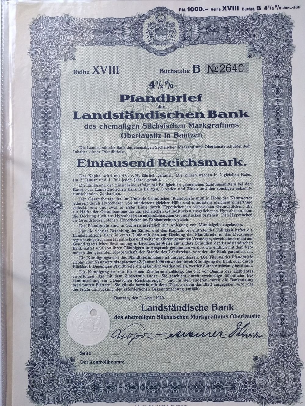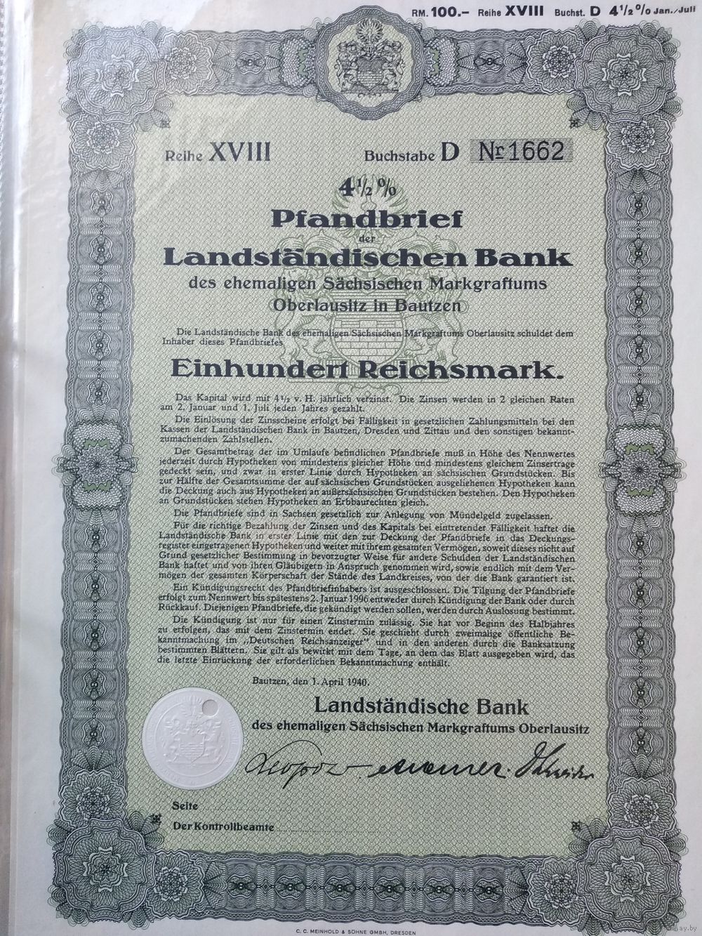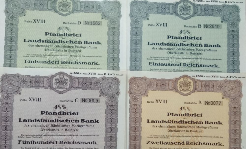 Германия, Третий рейх, Бауцен 1940, Земельные Облигации, Комплект от 100 до 2000 (4шт) Рейхсмарок -4,5%, Водяные знаки, Тиснение. Размер - А4