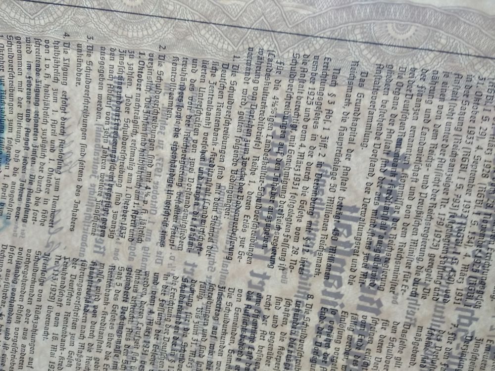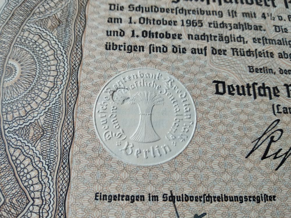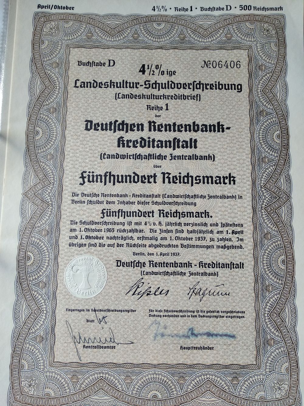 Германия, Третий Рейх, Берлин 1937, Министерство Культуры, Облигации, 500 Рейхсмарок -4,5%, Водяные знаки, Тиснение. Размер - А4