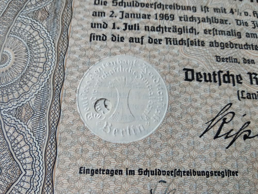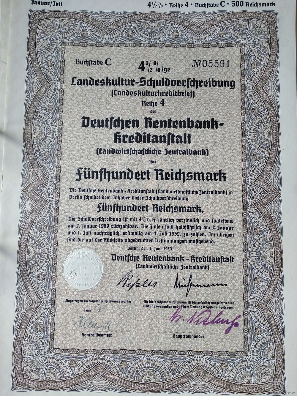Германия, Третий Рейх, Берлин 1939, Министерство Культуры, Облигации, 500 Рейхсмарок -4,5%, Водяные знаки, Тиснение. Размер - А4