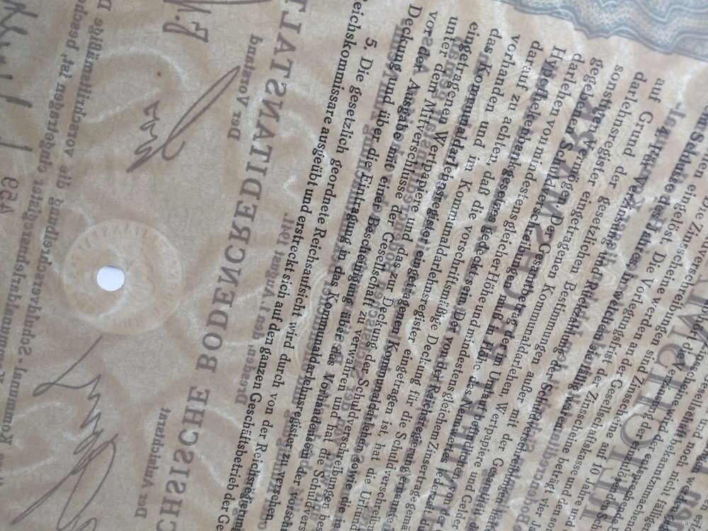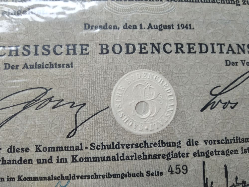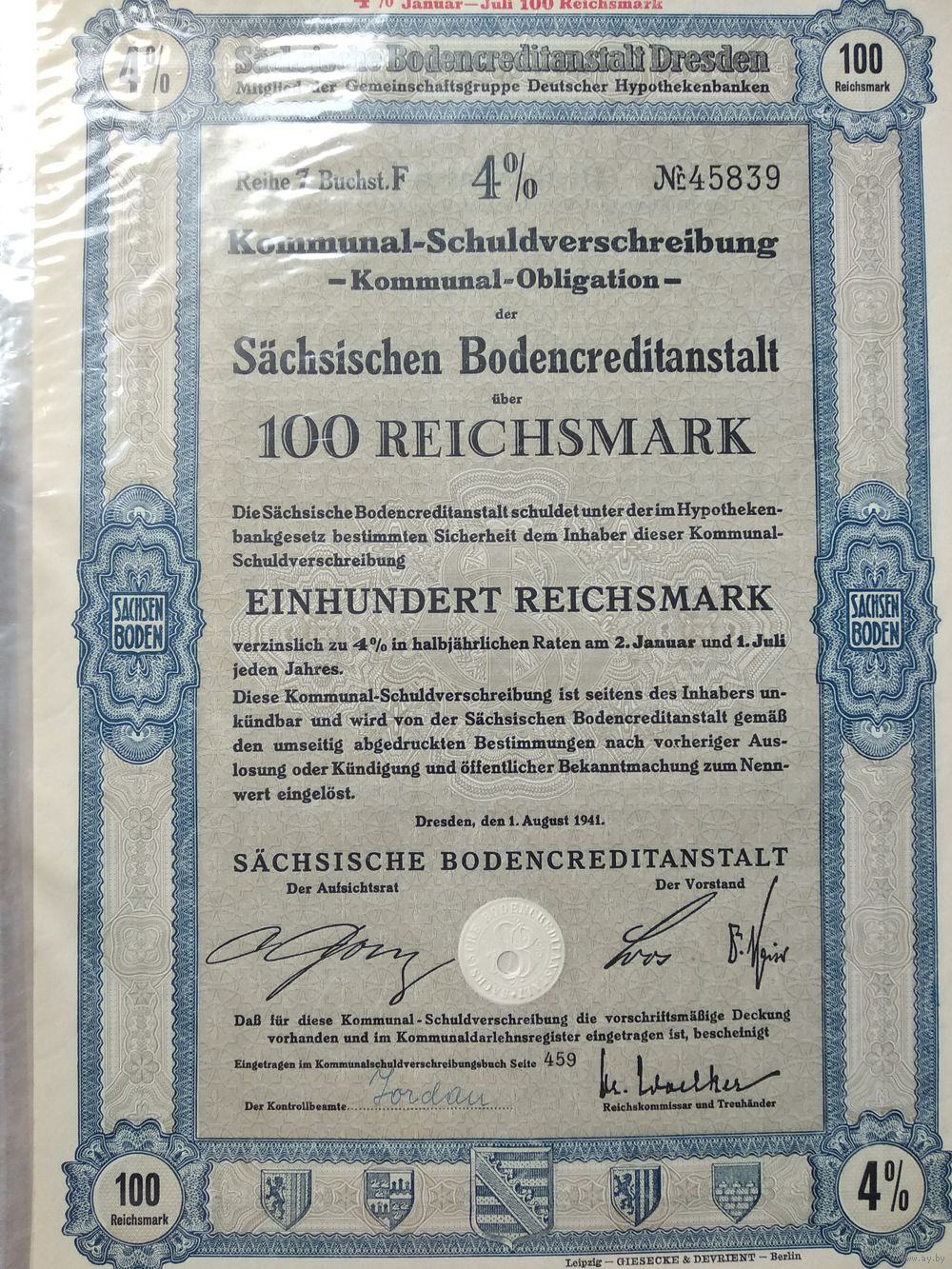 Германия,Третий Рейх, Дрезден 1941, Коммунальная Облигация, 100 Рейхсмарок -4%, Водяные знаки, Тиснение. Размер - А4