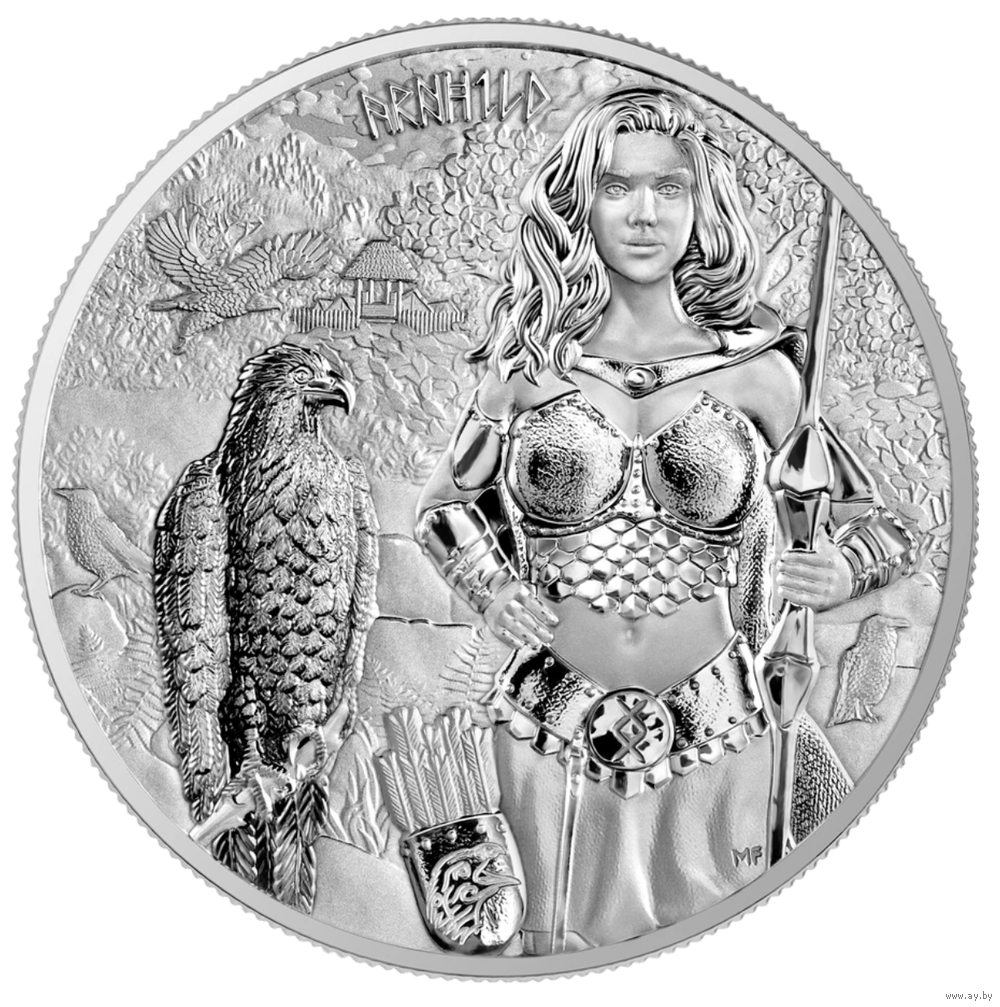 На аверсе монеты изображена Арнхильд – лучница и стражница крепости – в окружении орлов, символов силы, мужества и мудрости. Валькирия изображена в доспехах из закаленной кожи и плаще с капюшоном, что позволяет ей легко сливаться с лесом, защищая при этом свои владения. На поясе Арнхильды находится руна Ингваз, олицетворяющая непрерывность жизни, изобилие и защиту. В дизайне также присутствуют Хугинн и Мунинн, два ворона, служащие глазами Одина.