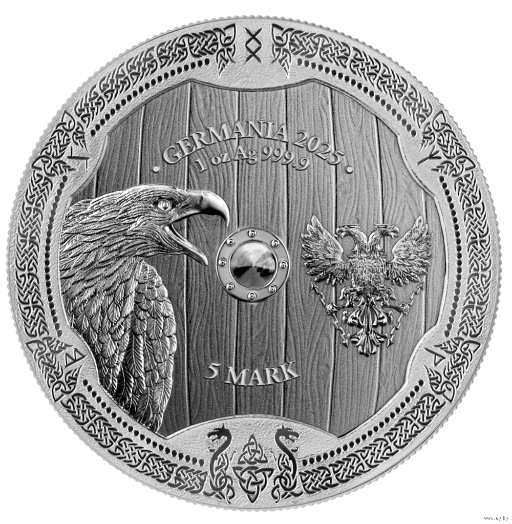 На реверсе изображен характерный мотив Germania Mint рядом с орлом, символическим животным Арнхильд. В центральной части щита изображены германские руны, сопровождаемые подробностями о году выпуска, номинале и составе металла.