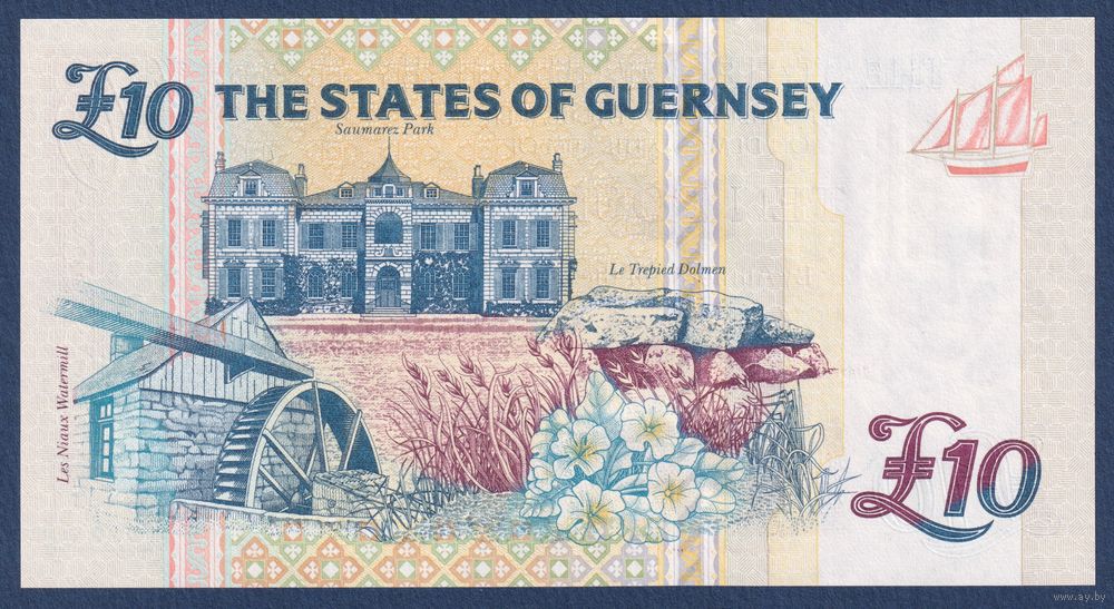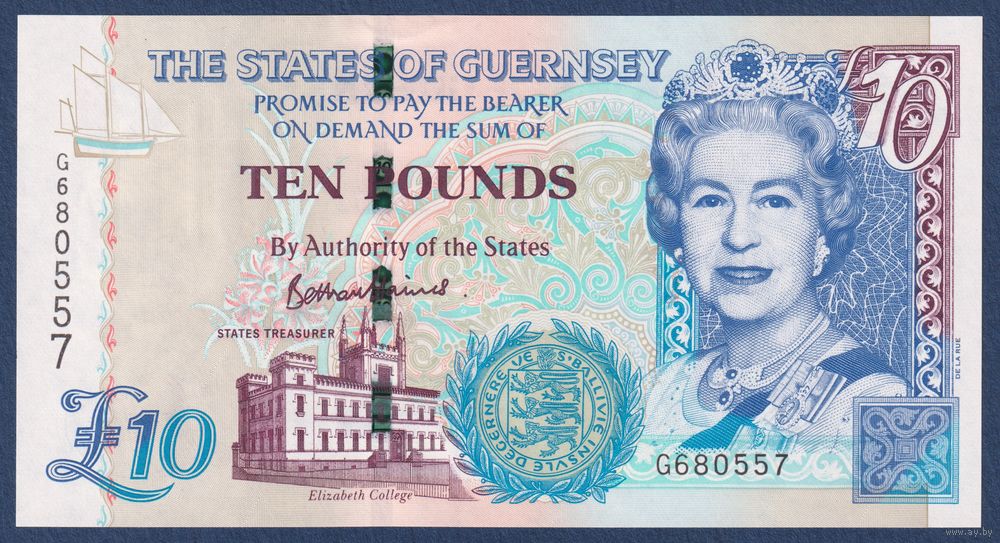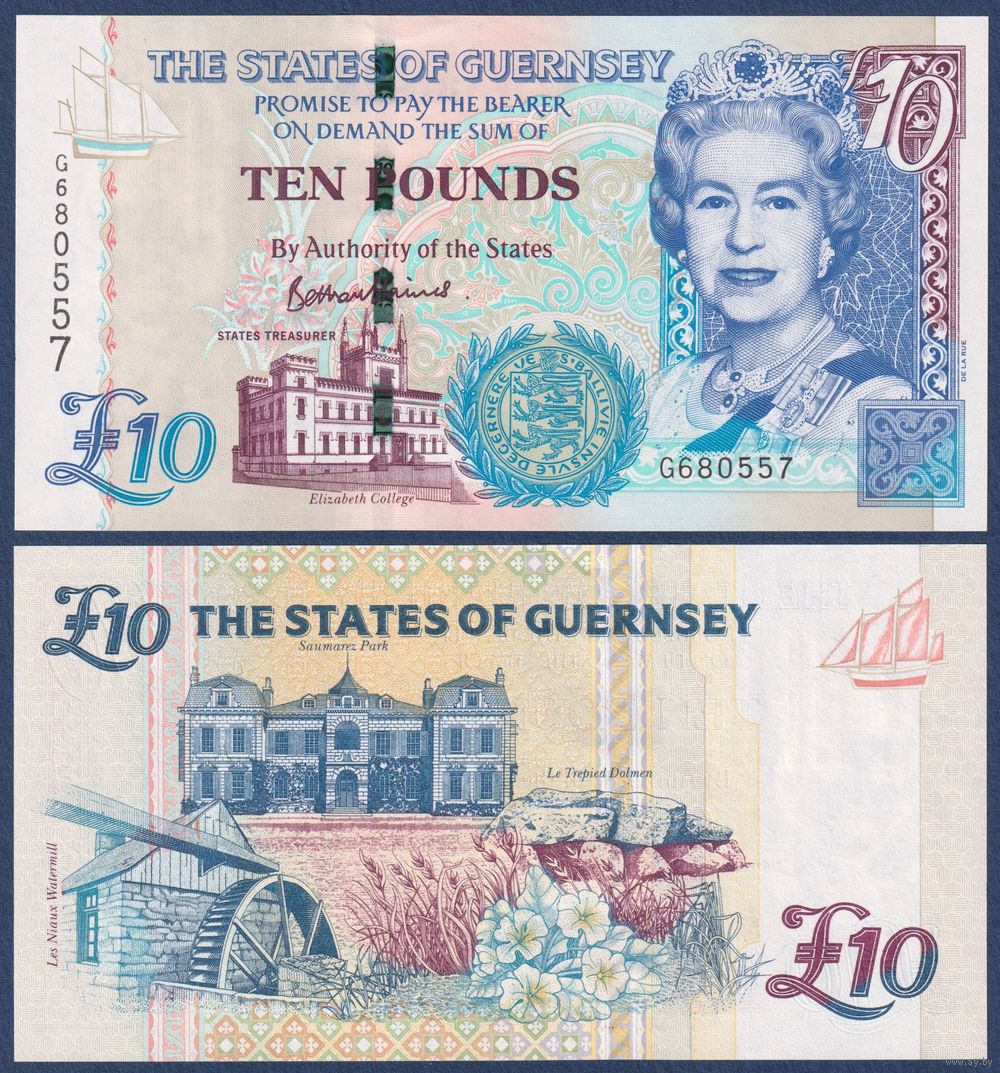 Гернси, 10 фунтов 1995-2023 г., P-57e (G, королева Елизавета II, парк Саумарес), UNC