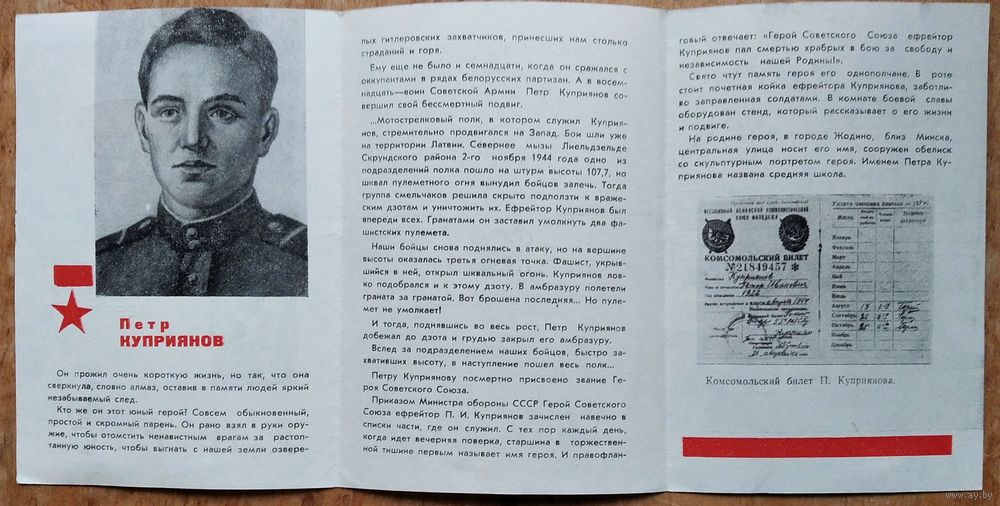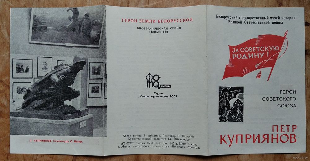В. Абрамов. Герой Советского Союза П. И. Куприянов. Минск : Творческая студия "Фото и жизнь" Союза журналистов БССР. 1971 г. 1 л. (сложенный в 6 с.)