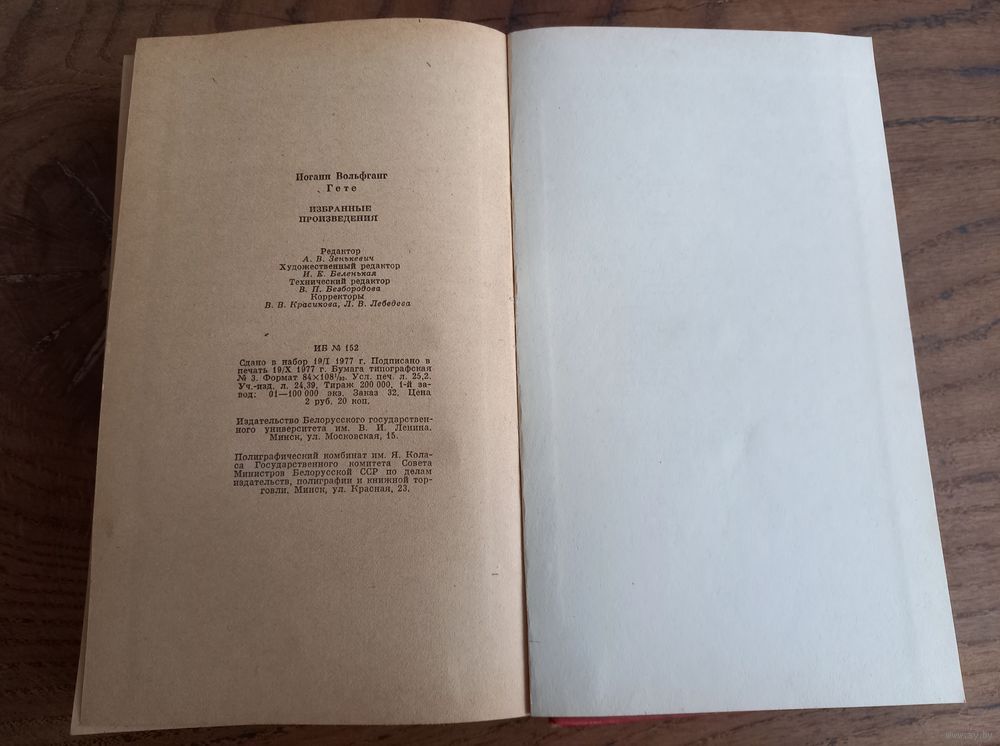 И. В. Гете, 1977 год, избранные произведения. Минск, БГУ им. Ленина, тираж 200 000 экземпляров.