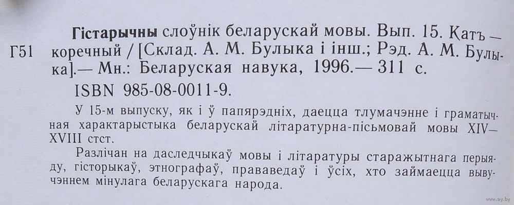 Гістарычны слоўнік беларускай мовы. Вып. 15 : Катъ - коречный. Склад.: А.М.Булыка і інш. Акадэмія навук Беларускай ССР, Інстытут мовазнаўства імя Я. Коласа. Мінск. Беларуская навука, 1996 г. 311 с. Цверды пераплет.