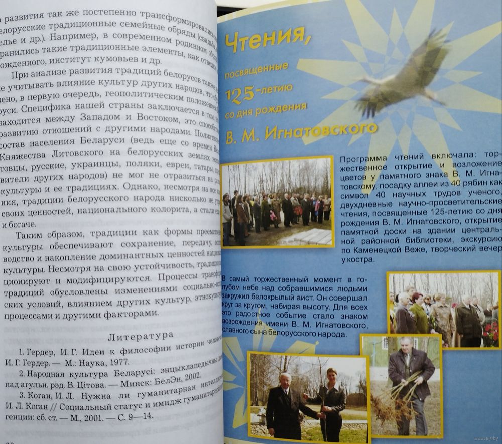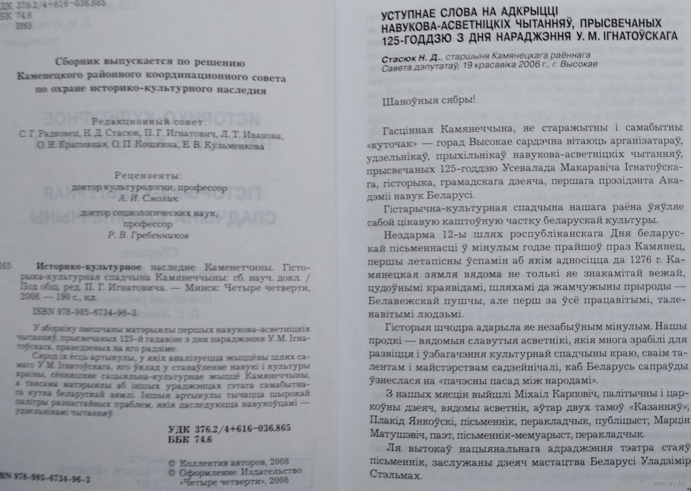 Большой формат. Тираж 500 экз. 192 стр. Сборник научных докладов : 125-летию со дня рождения В. М. Игнатовского. Историко-культурное наследие Каменетчины: