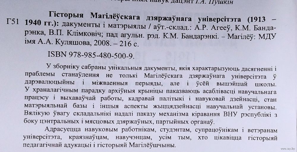Гісторыя Магілеўскага дзяржаўнага універсітэта (1913-1940 гг.): дакументы і матэрыялы. Міністэрства адукацыі Рэспублікі Беларусь, Установа адукацыі "Магілёўскі дзяржаўны універсітэт імя А. А. Куляшова", Установа "Дзяржаўны архіў грамадскіх аб'яднанняў Магілёўскай вобласці". - Магілёў : МДУ, Дзяржаўны архіў грамадскіх аб'яднанняў Магілёўскай вобласці, 2008 г. 214 с. Мяккая вокладка.