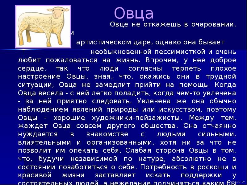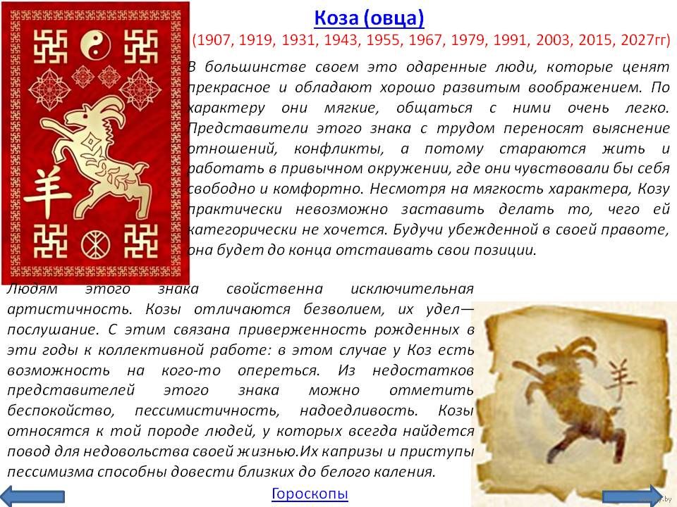 -------------------------Таблица годов Овцы----------------------1931 23 января 1931 – 10 февраля 1932 Белый Металл 1943 10 февраля 1943 – 29 января 1944 Черный Вода 1955. 28 января 1955 – 14 февраля 1956 Синий Дерево 19671. 4 февраля 1967 – 2 февраля 1968 Красный Огонь 19792 февраля 1979 – 21 января 1980 Желтый Земля 1991 .18 февраля 1991 – 6 февраля 1992 Белый Металл 2003 . 29 января 2003 – 15 февраля 2004 Черный Вода 2015. 14 февраля 2015 – 2 февраля 2016 Синий Дерево 2027. 2 февраля 2027 – 22 января 2028 Красный Огонь.