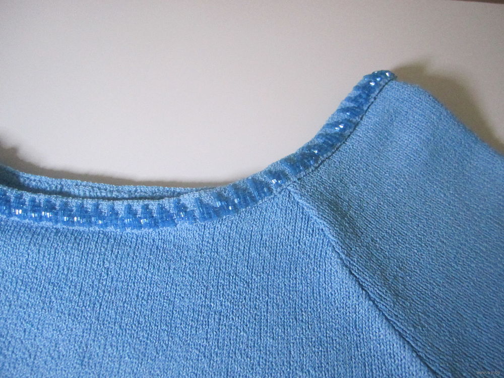 Р-р 42-44. Ткань стрейч, вискоза и еще что -то... Тянется хорошо, очень приятный к телу. Горловина расшита бисером. Подарила подруга, привозила из Европы, но к сожалению мал.... Дефектов нет.