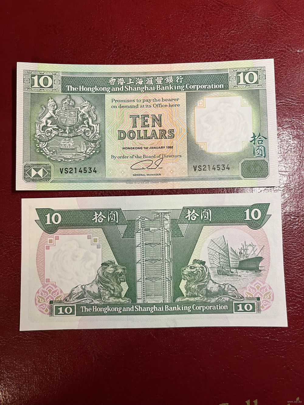 Гонконг, 10 долларов 1992 г., P-191c (VL, львы, корабль), UNC
