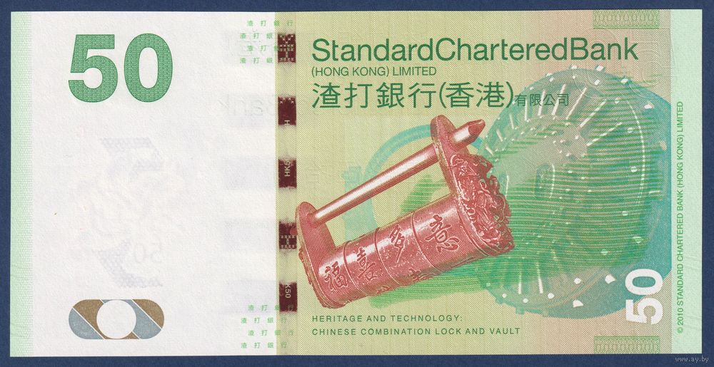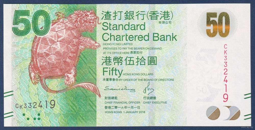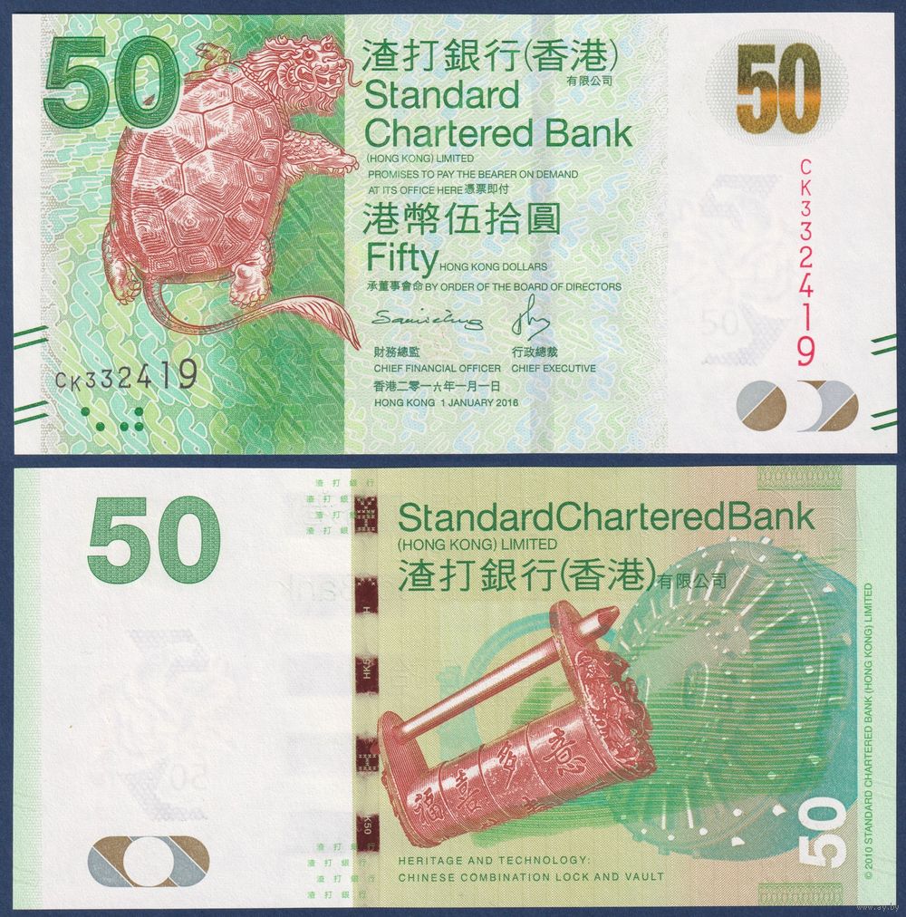 Гонконг, 50 долларов 2016 г., P-298e (CK, мифическая черепаха, китайский кодовый замок), UNC