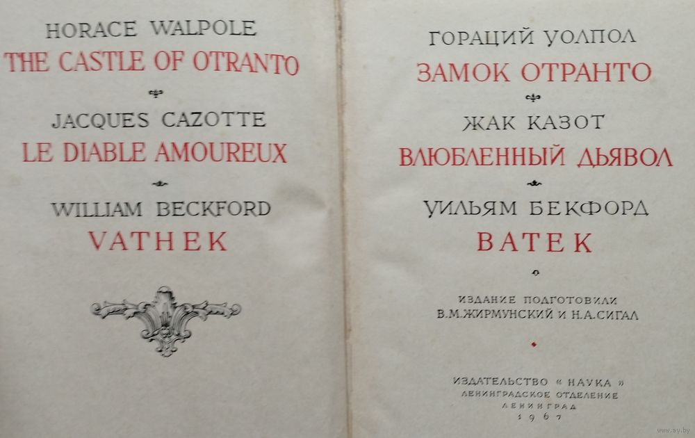 "Ватек" (1786) - Ватек — девятый халиф из рода Абассидов, погрязший в пороке и отдавший свою жизнь наслаждению, которое стало смыслом его жизни. Его великодушие было столь безгранично, сколь безудержен был его разврат. Однако вскоре как оно чаще всего и бывает, ему всё наскучило — ни пища, ни искусство, ни диковинки, ни женщины уже не приносили ему наслаждения. Но однажды во дворец к халифу пришел странный путник, предложивший ему невиданные сокровища в обмен на несколько кровавых жертв. Склоняемый своей матерью, хитрой и коварной царицой Каратис, Ватек принимает предложение...