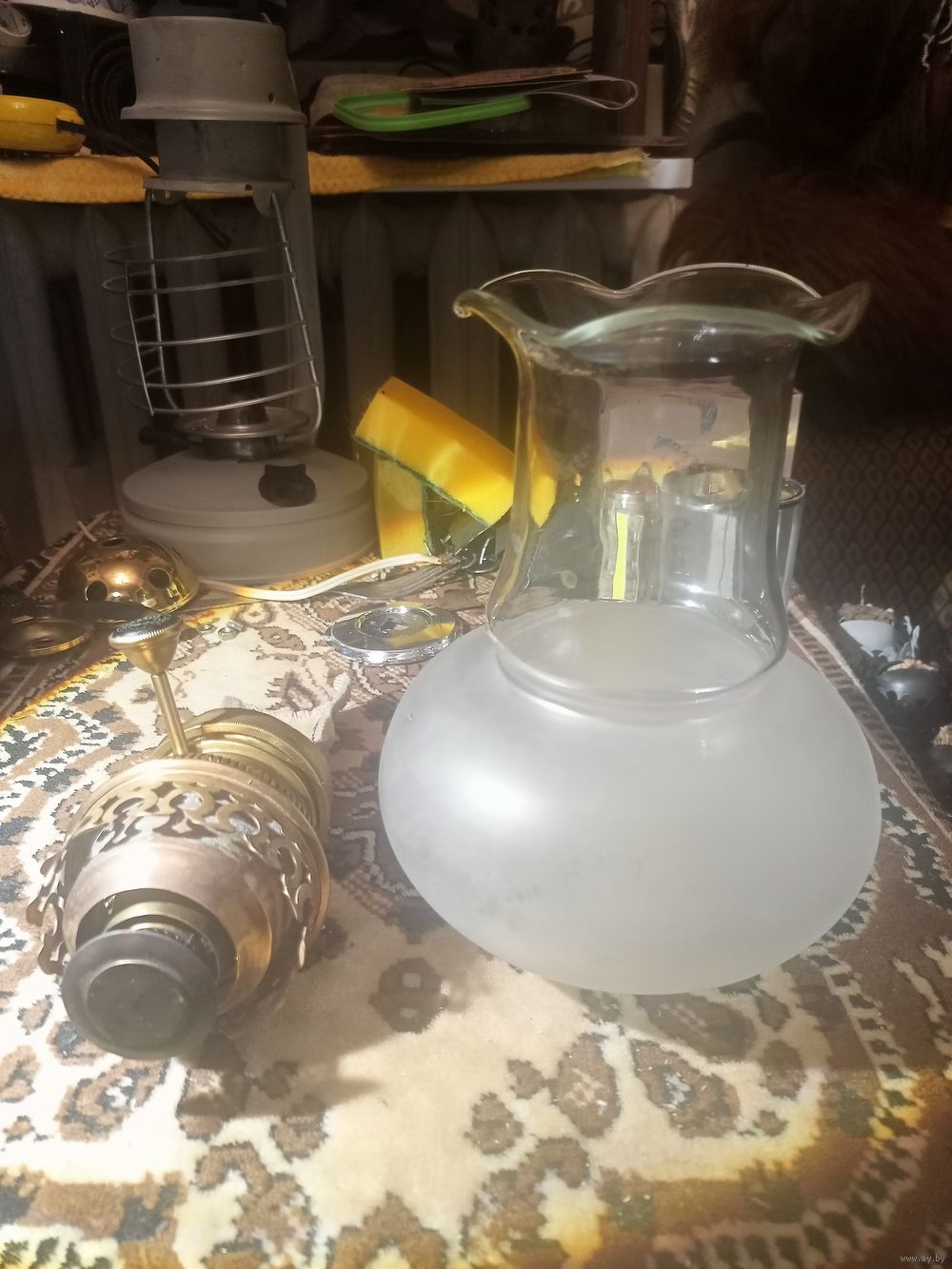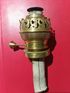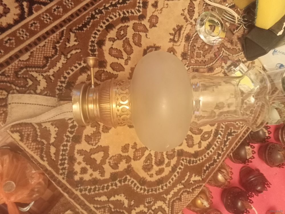 Горелка для керосиновой лампы с установочной гайкой, матовым плафоном, рассекателем пламени и плоским фитилем шириной 65 мм. Исправный механизм подачи фитиля, материал горелки латунь. Рассчитана на установку лампового стекла с посадочным диаметром 65 мм.