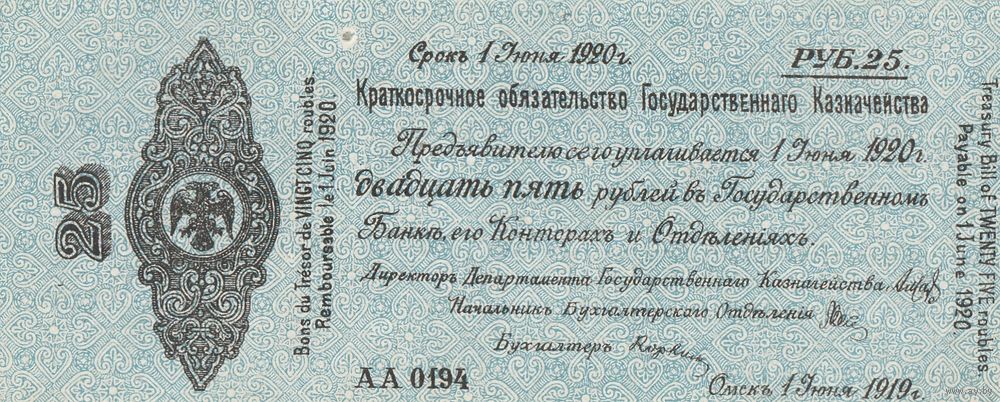 Гос.Обязательство 1920 года. ОмскЬ. 25 рублей. Серия АА. Состояние