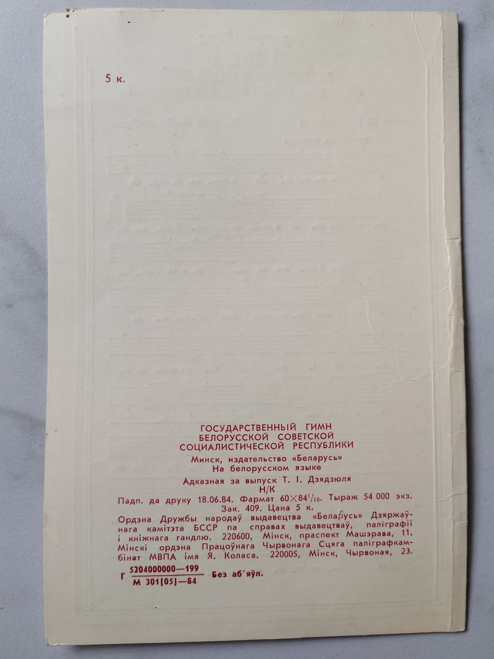 Государственный гимн БССР. 1984 г. Тираж 54 000 шт