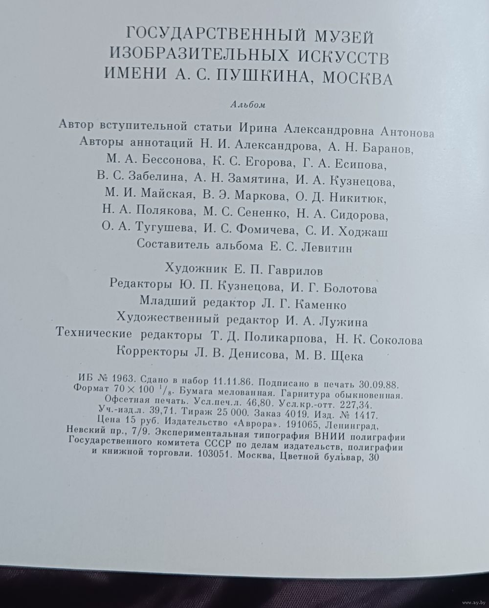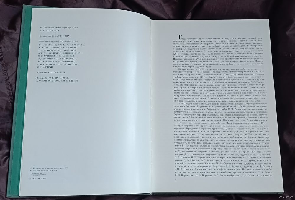 Государственный музей изобразительных искусств имени А. С. Пушкина, Москва. Альбом. Издательство Аврора, Ленинград 1989, стр. 288, большой энциклопедический формат (размер книги в см: 34x24,5x2), твердый переплет, мелованная бумага.