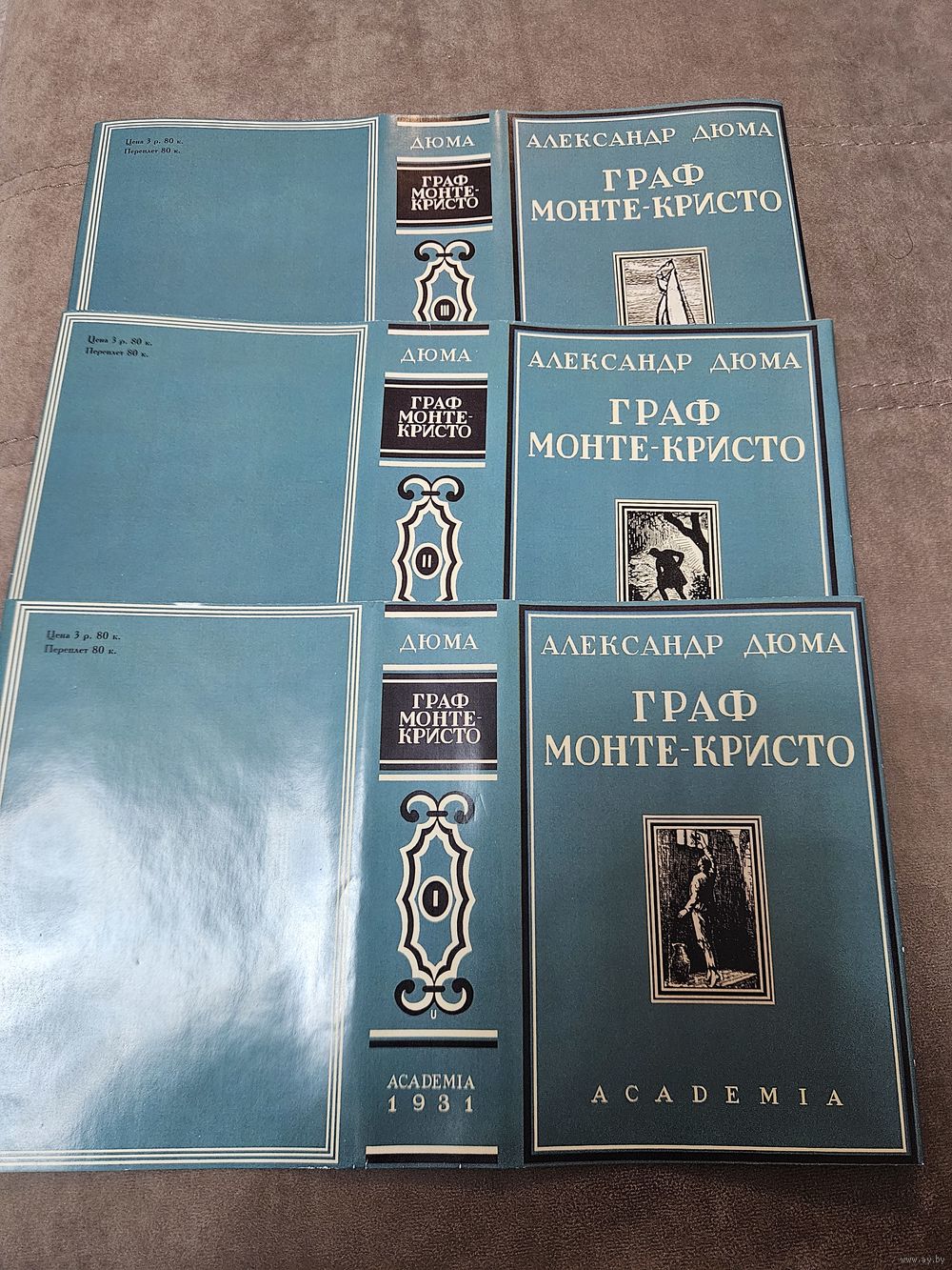 Блоки - без потерь. Супера- копии. Реставрация корешков на 1 и 3 томах. 2том- розная ткань наклеена на новую основу. В целом состояние хорошее.
