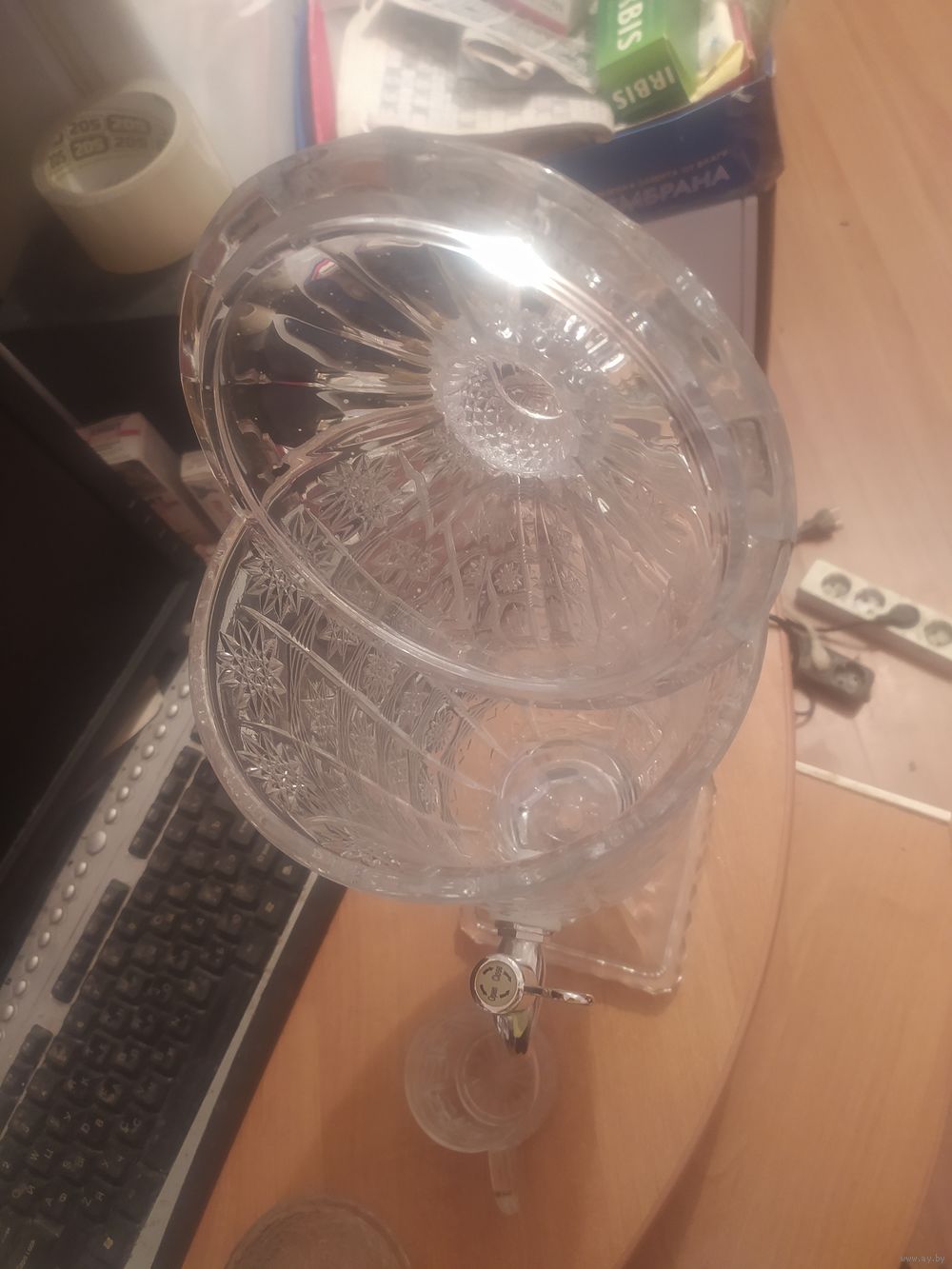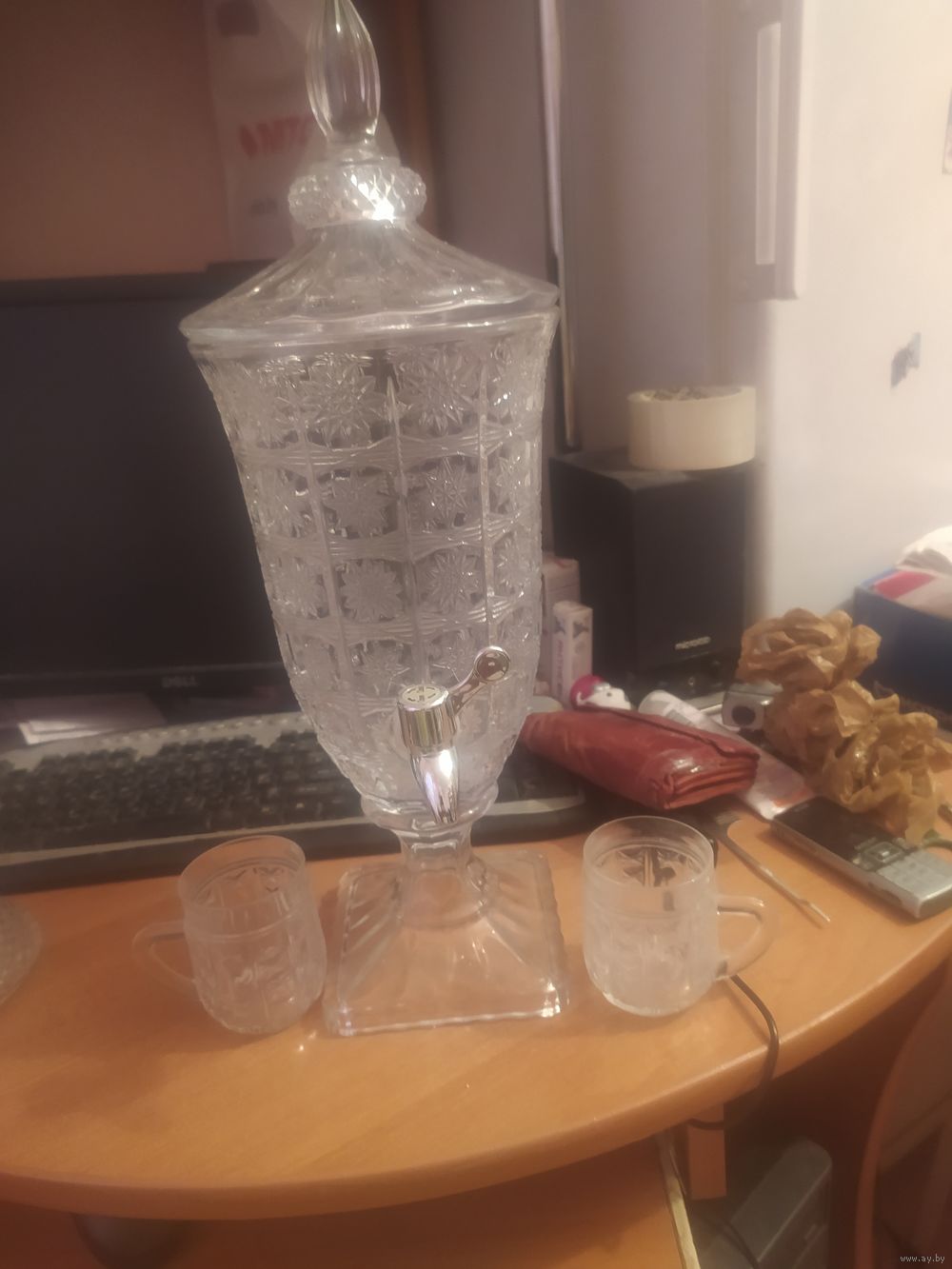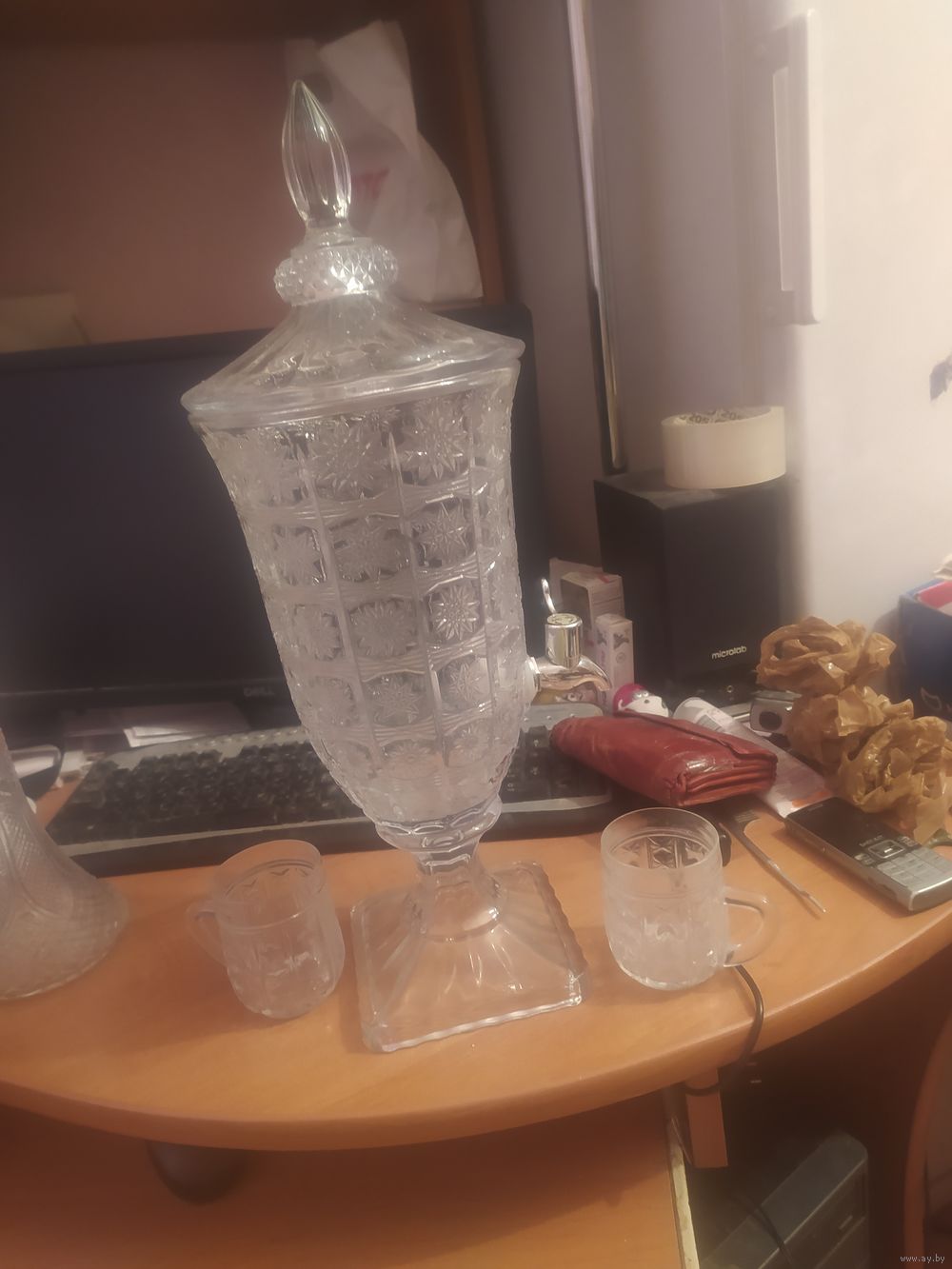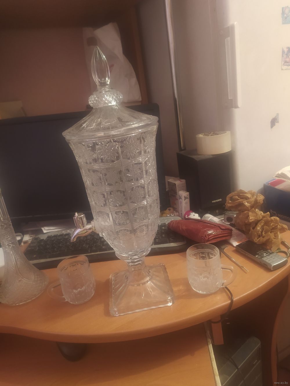 Хрустальный кубок с краником литра на 2,5. И 2 бокальчика.