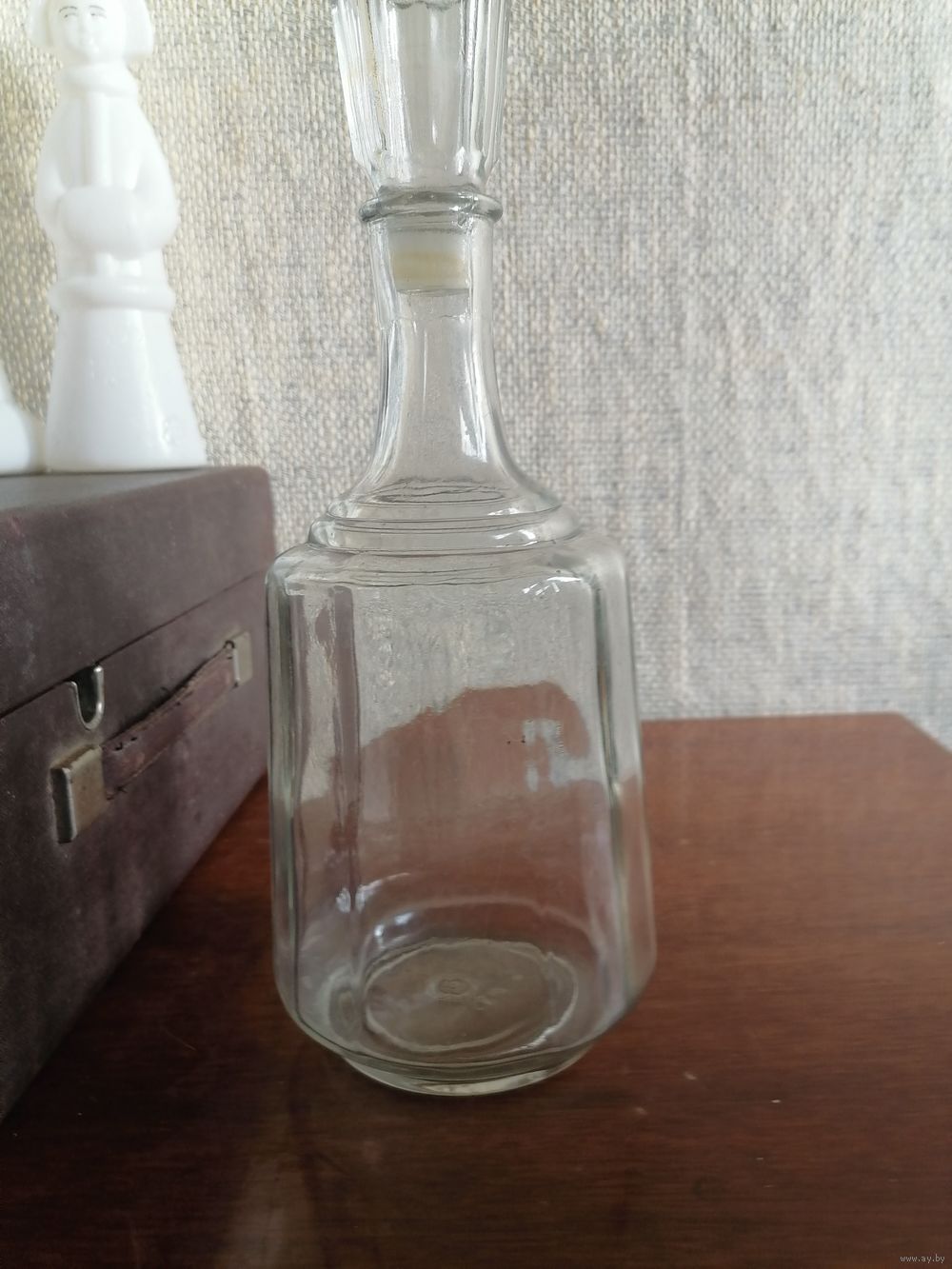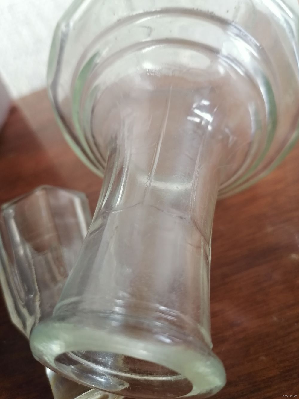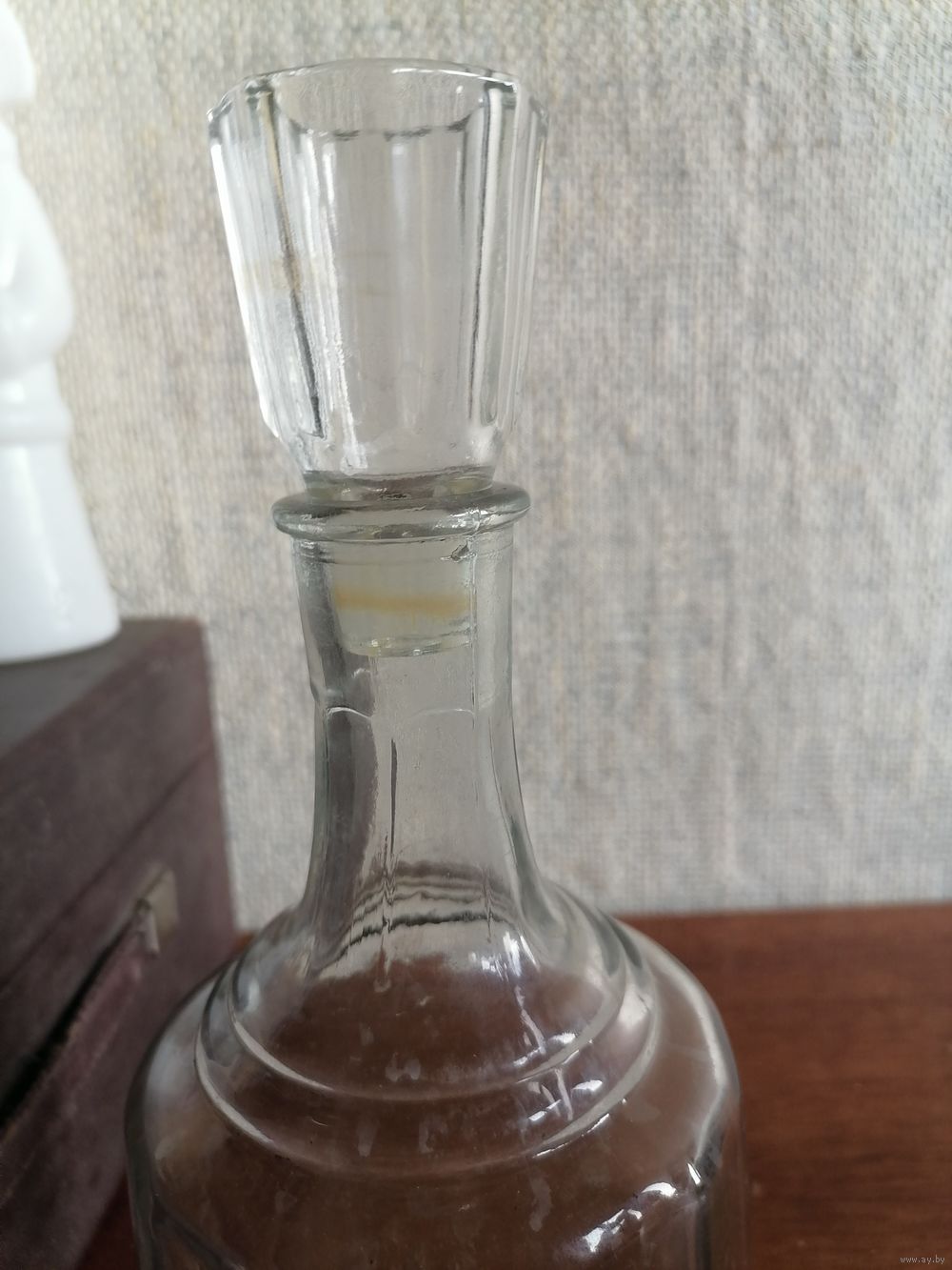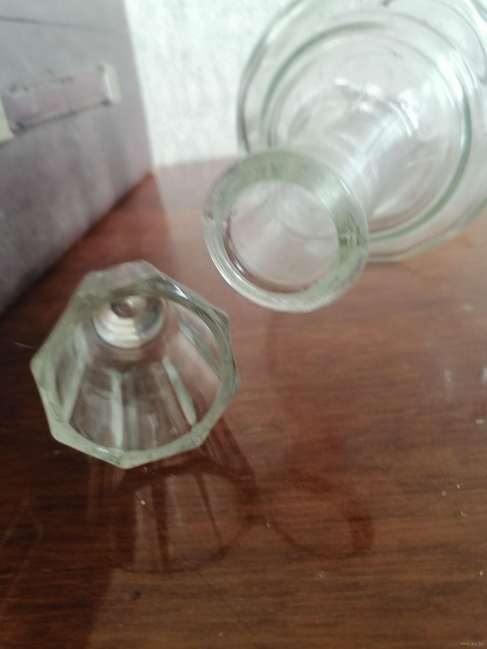 Графин СССР.Председательский.Ребристый с пробкой.Сколов и трешин нет.Нюанс только в том что диаметр нижней части пробки чуть меньше чем диаметр горлышка графина.