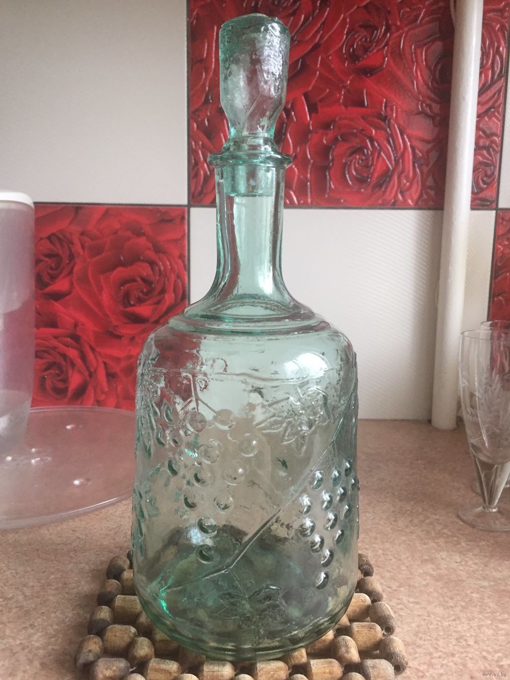 Графин "Виноградная лоза", СССР. Из толстого стекла зеленоватого цвета. По всему периметру графина выпуклый рисунок : гроздья винограда и виноградные листья. Состояние отличное. Пробка стеклянная (не родная). Вышлю любой почтой.