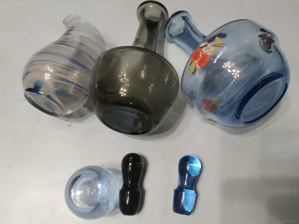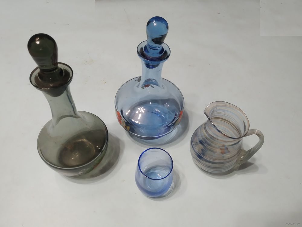 Графины цветного стекла: синий - высота 18 см; ёмкость 600 мл + рюмка 100 мл;