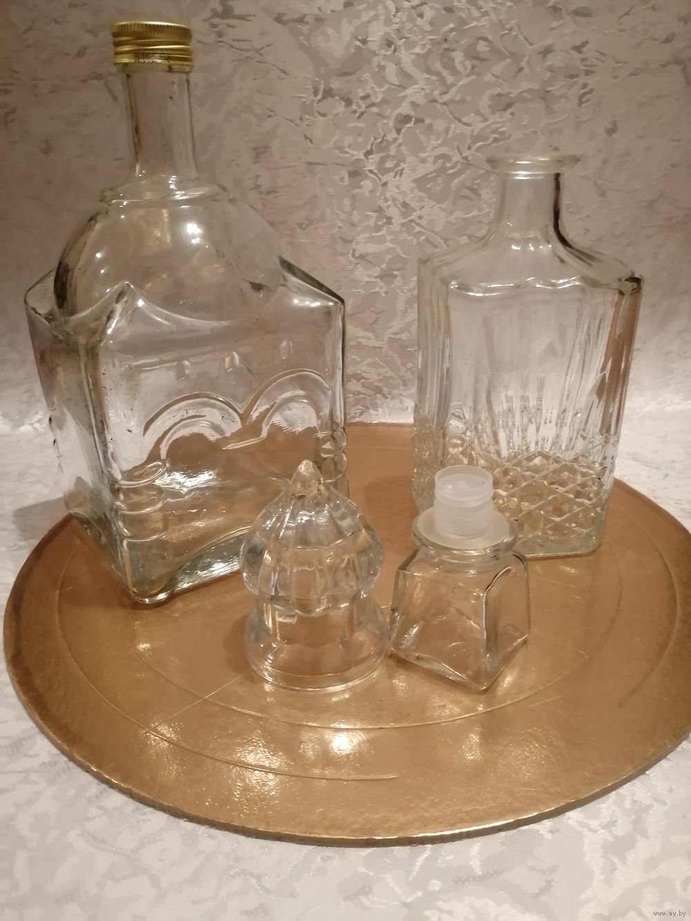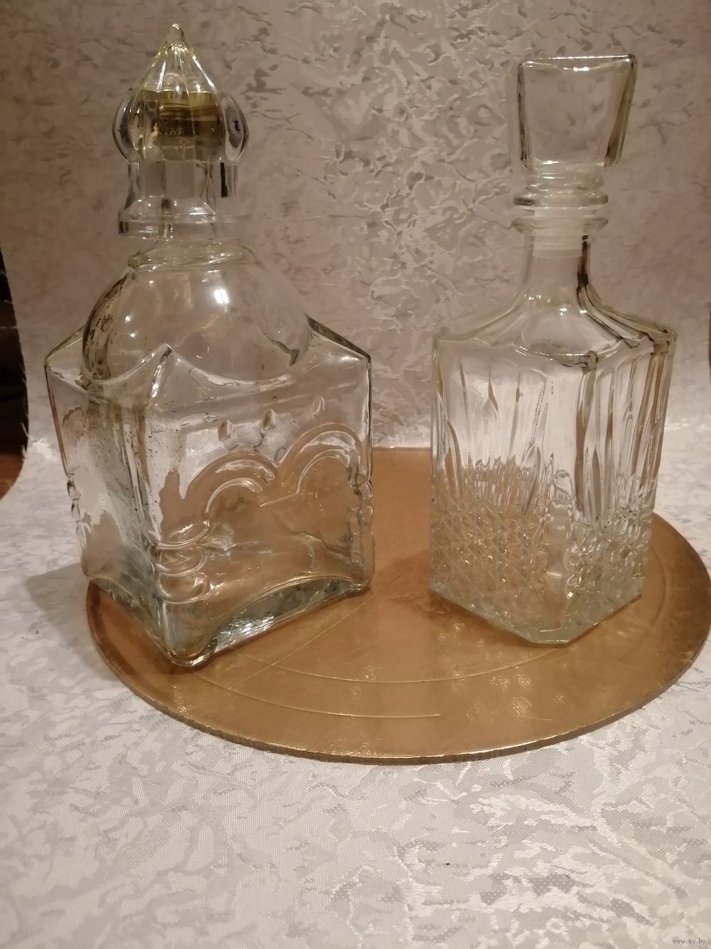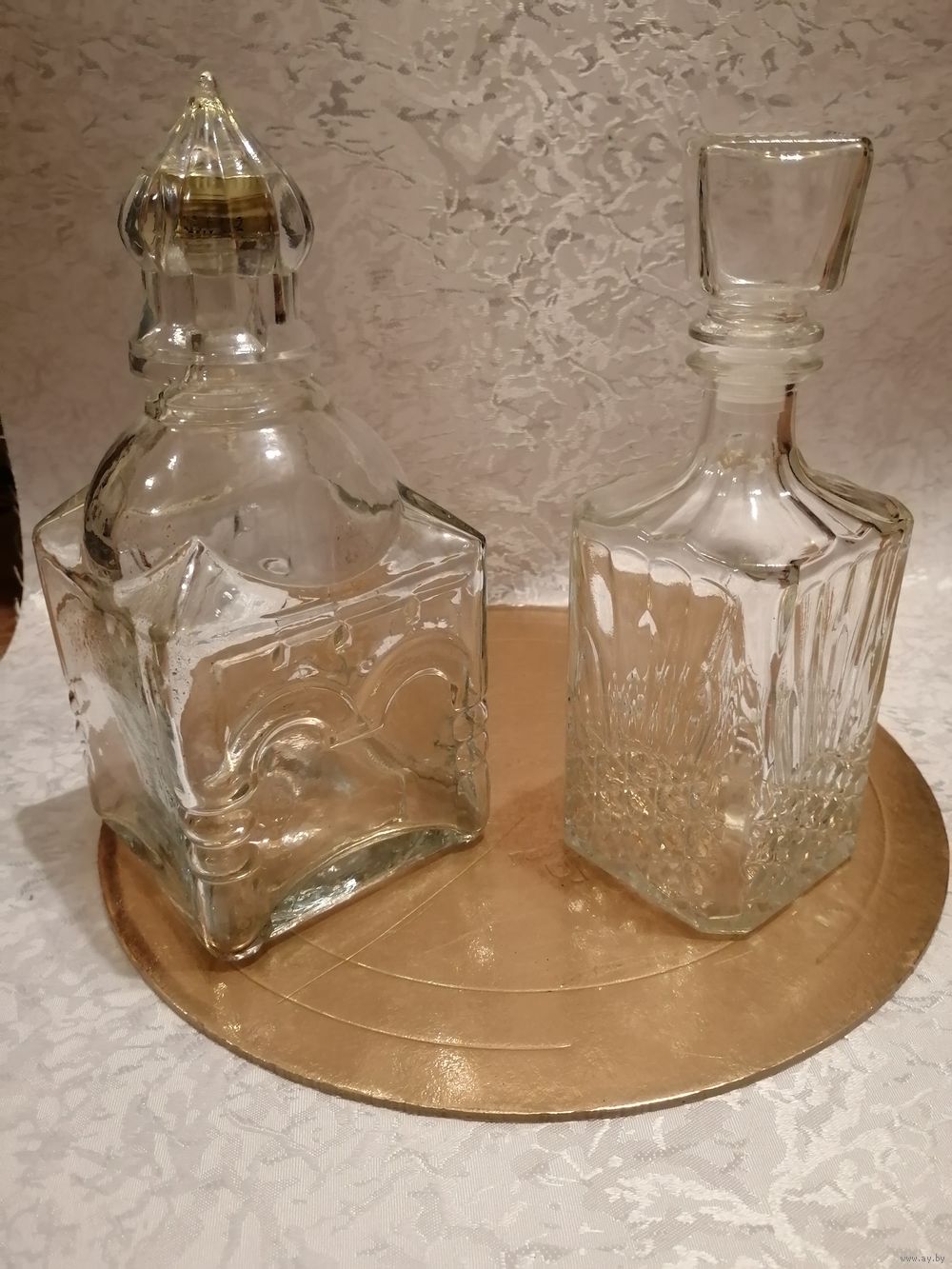 Прекрасные графины для сервировки стола. Левый в форме храма, рюмка-непроливайка, 1л. Правый благородный хрусталь 0,5литра. Пробки родные без повреждений.... Высылаю любой почтой в день оплаты.... Смотрите мои лоты. Спасибо