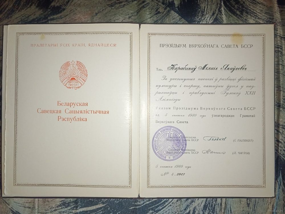 Грамата Вярхоунага Савета БССР. 1980г. Олимпиада 80. Вкладной лист можно достать. Состояние отличное. Могу выслать по почте или Европочтой