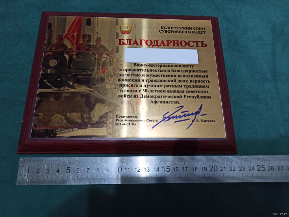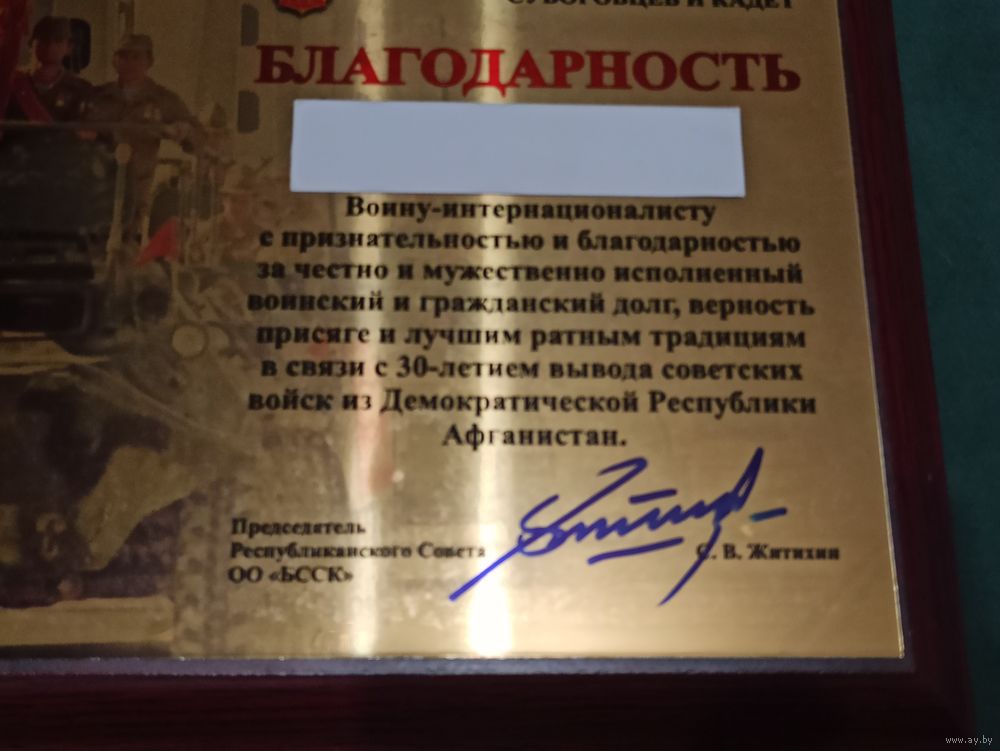 Грамота «Благодарность» воину-интернационалисту от Белорусского союза суворовцев и кадет.