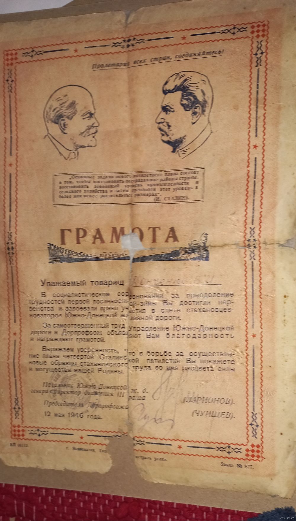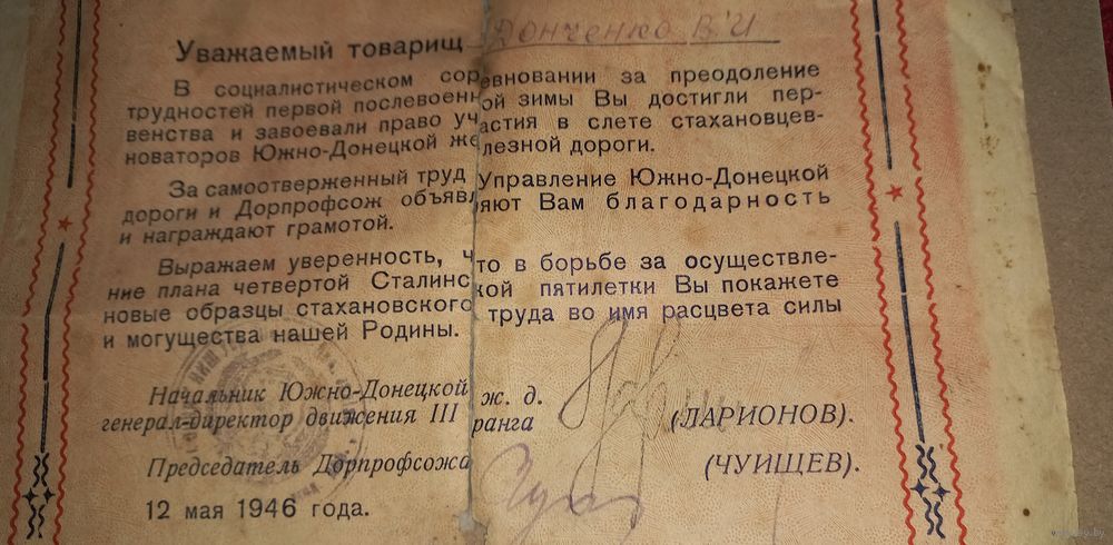 Грамота Донецкая южная Ж /Д 1946 подпись генерала-директора 3 ранга(А47)