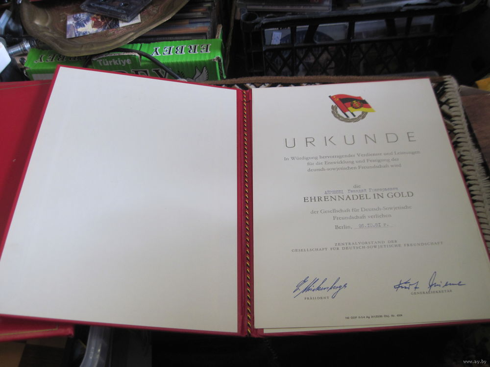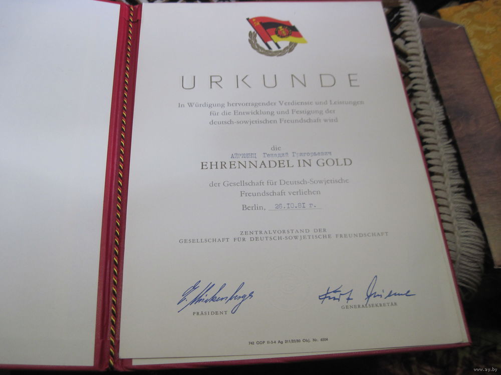Грамота ГДР За укрепление Советско-Германской дружбы 1981 г.