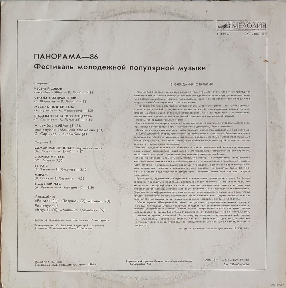 Грампластинка "Панорама-86 (1-ый выпуск)" Фестиваль молодежной популярной музыки