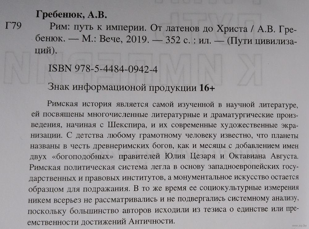 Гребенюк А. Рим: путь к империи. От латенов до Христа. М. Вече 2019г. 352 с., илл. твердый переплет, обычный формат.