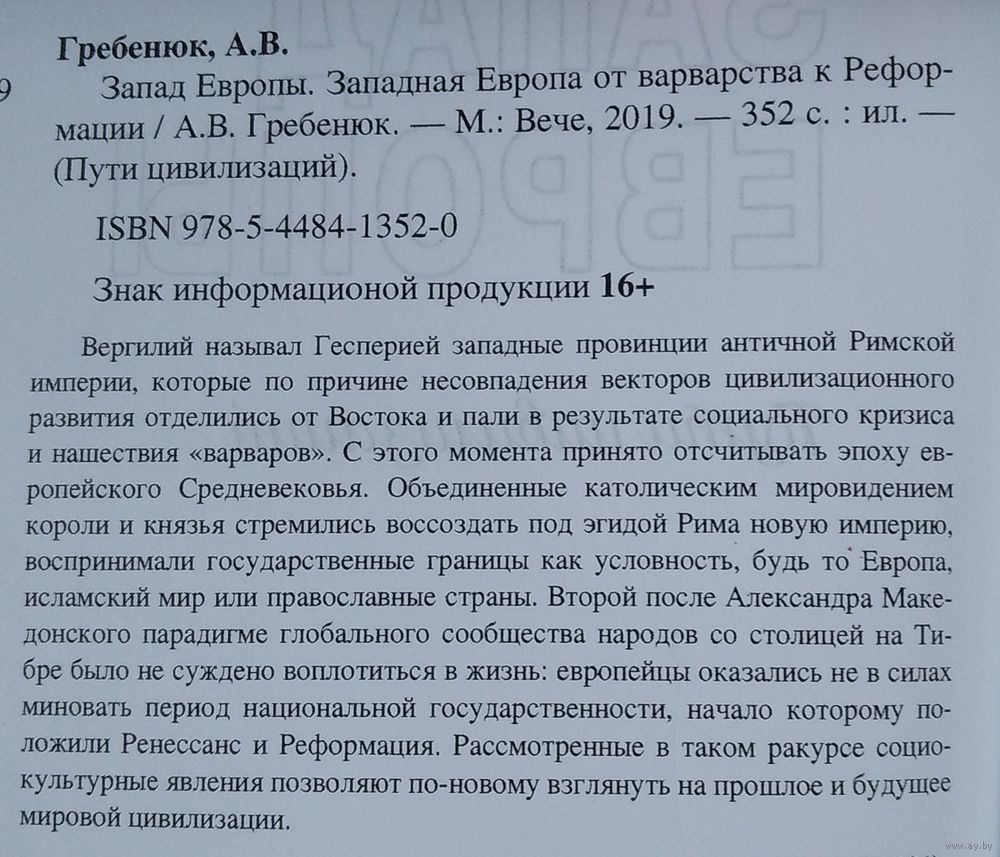 Гребенюк А.В. Запад Европы. Западная Европа от варварства к Реформации Серия: Пути цивилизаций М Вече 2019 г. 352с. Твердый переплет. Обычный формат.