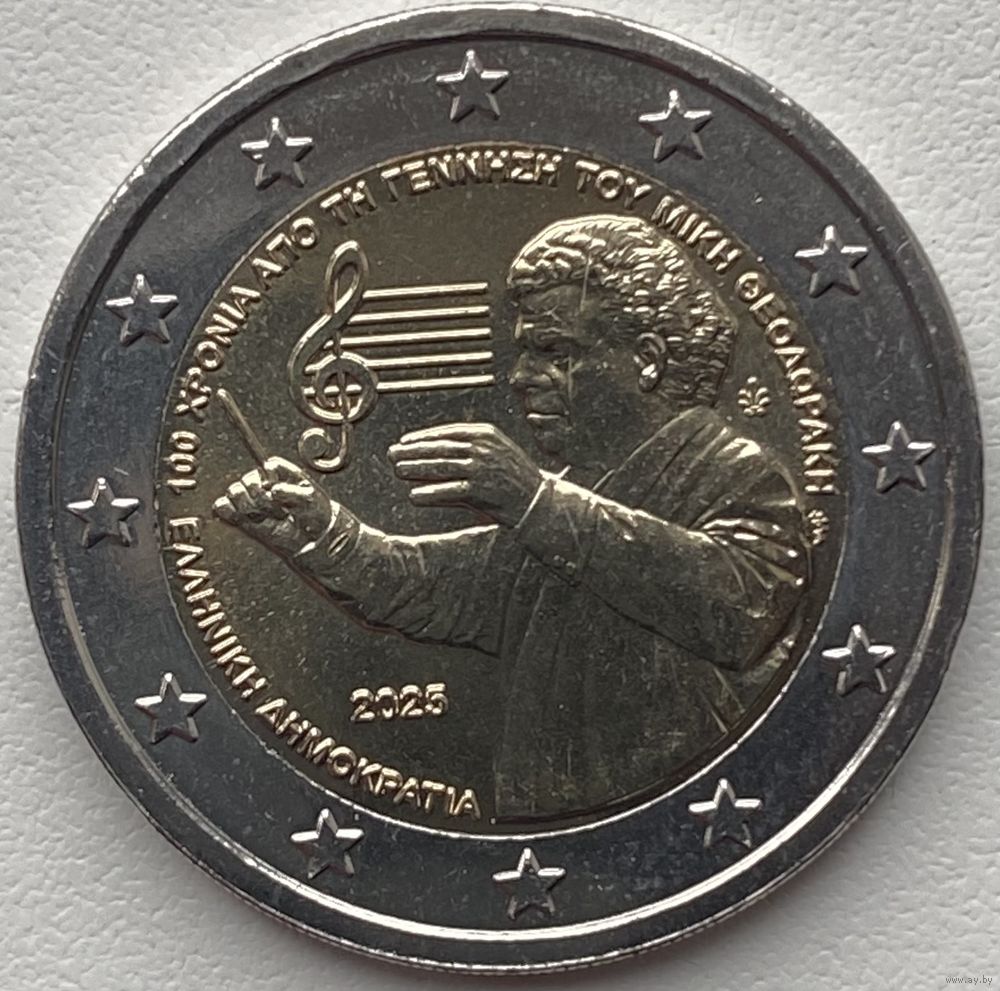 Греция 2 евро 2025 г. 100 лет со дня рождения Микиса Теодоракиса
