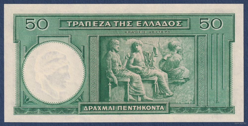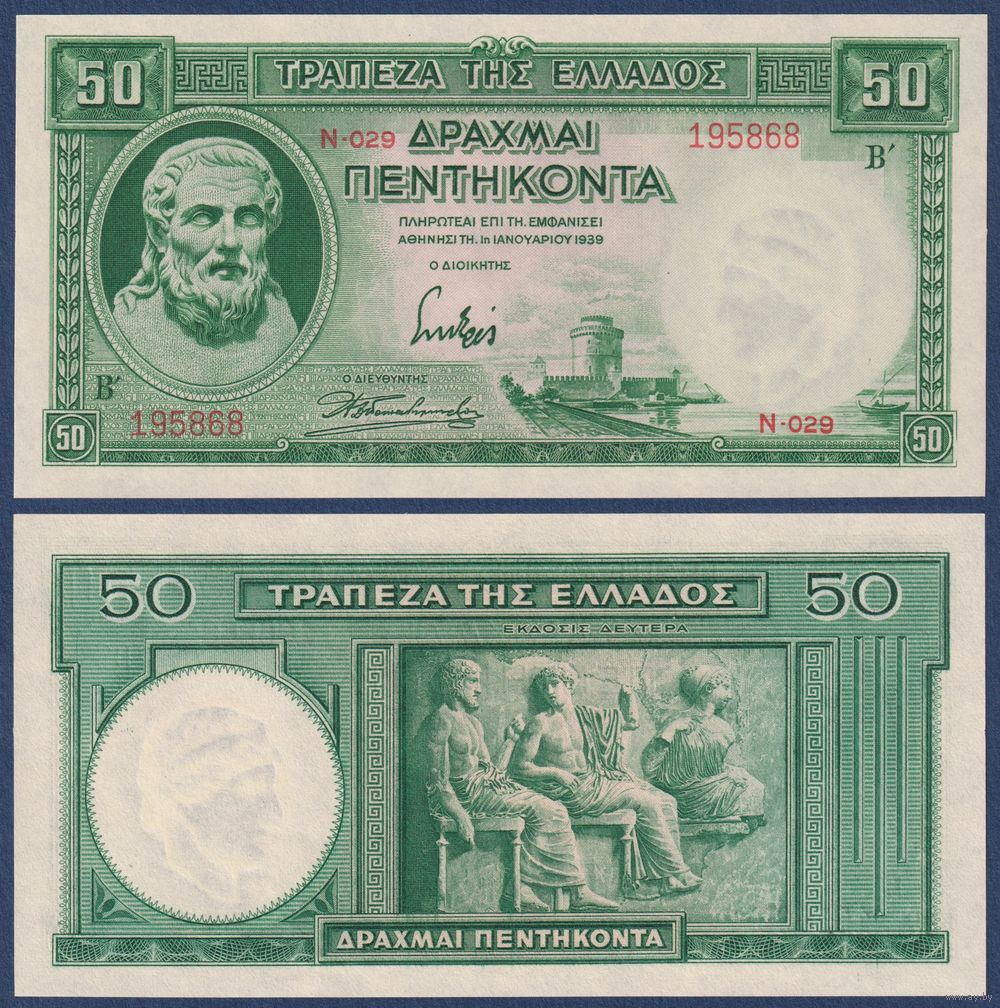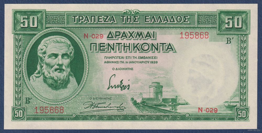 Греция, 50 драхм 1939 г, P-107 (N, Гесиод, Белая башня в Салониках), UNC