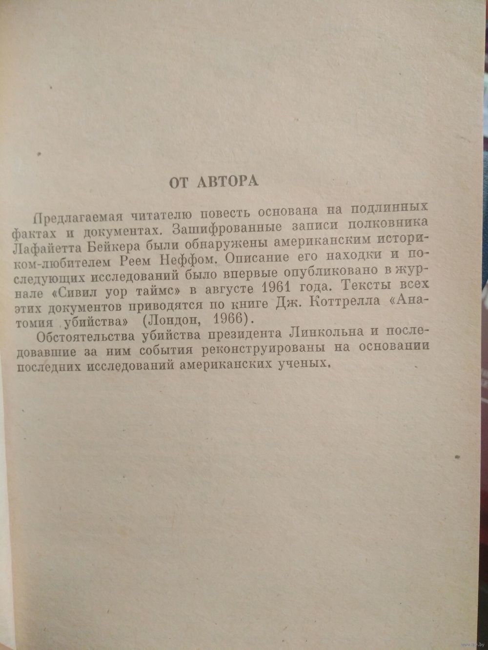 Повесть воспроизводит подлинные события, связанные c раскрытием заговора и убийства президента США Линкольна в 1865 году. Параллельной темой проходит убийство президента Кеннеди в 1963 году.
