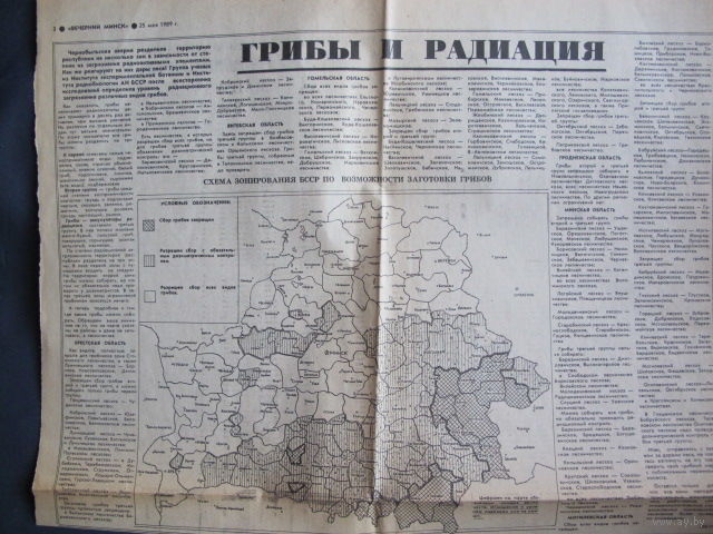 Грибы и радиация. Схема зонирования БССР по возможности заготовки грибов. Вечерний Минск 25.05.1989 (вырезка)