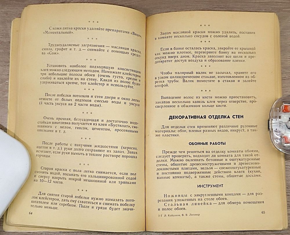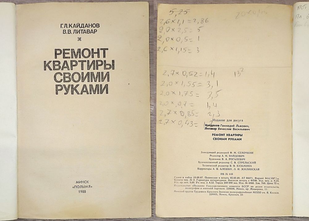 «Ремонт квартиры своими руками» — это практическое руководство, написанное Геннадием Львовичем Кайдановым и Вячеславом Васильевичем Литаваром (впервые издано в 1978 году, переиздавалось в 1988-м издательством «Полымя»). Книга представляет собой справочное пособие для тех, кто планирует выполнять ремонтные и отделочные работы самостоятельно. Основная цель авторов — помочь домашнему мастеру сэкономить средства и добиться качественного результата без привлечения профессиональных бригад