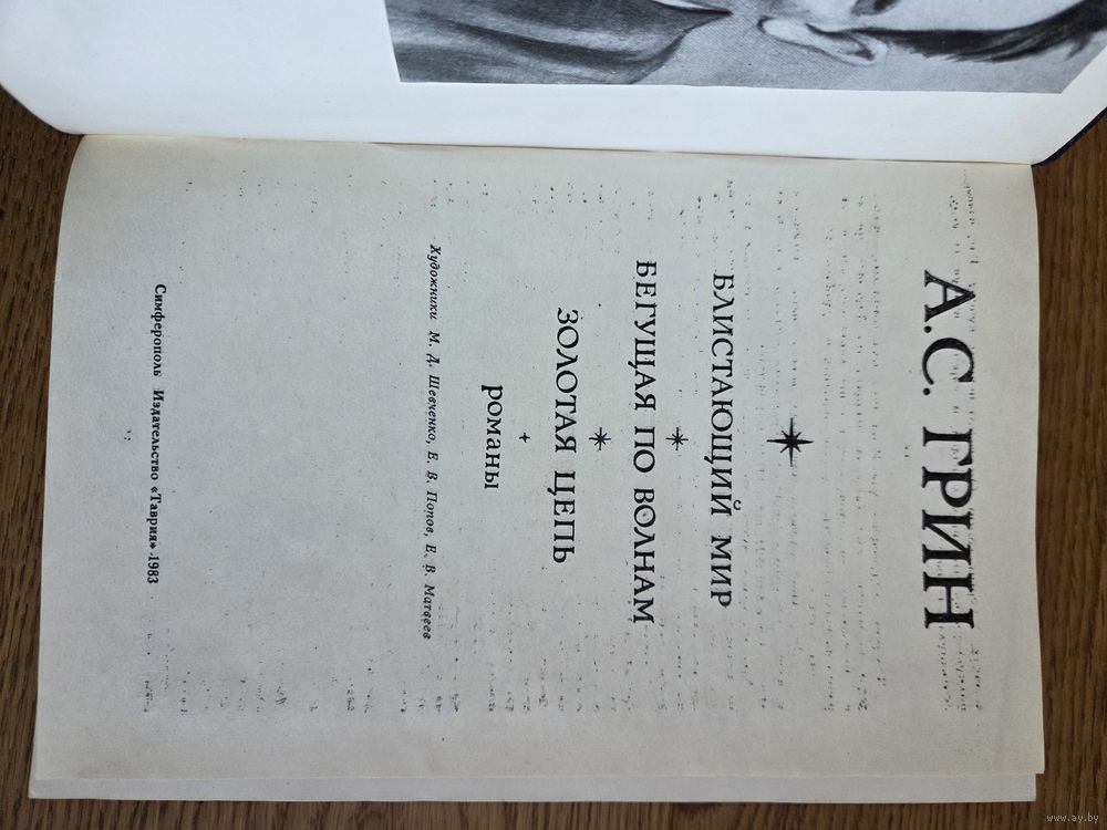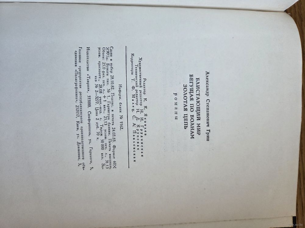 Грин А.С. Симферополь, Таврия, 1983 Романы: Блистающий мир. Бегущая по волнам. Золотая цепь. 376 с., 12 л. ил. «Блистающий мир», «Бегущая по волнам», «Золотая цепь» -три наиболее известных романа А. С. Грина. В них вполне проявилась его удивительная