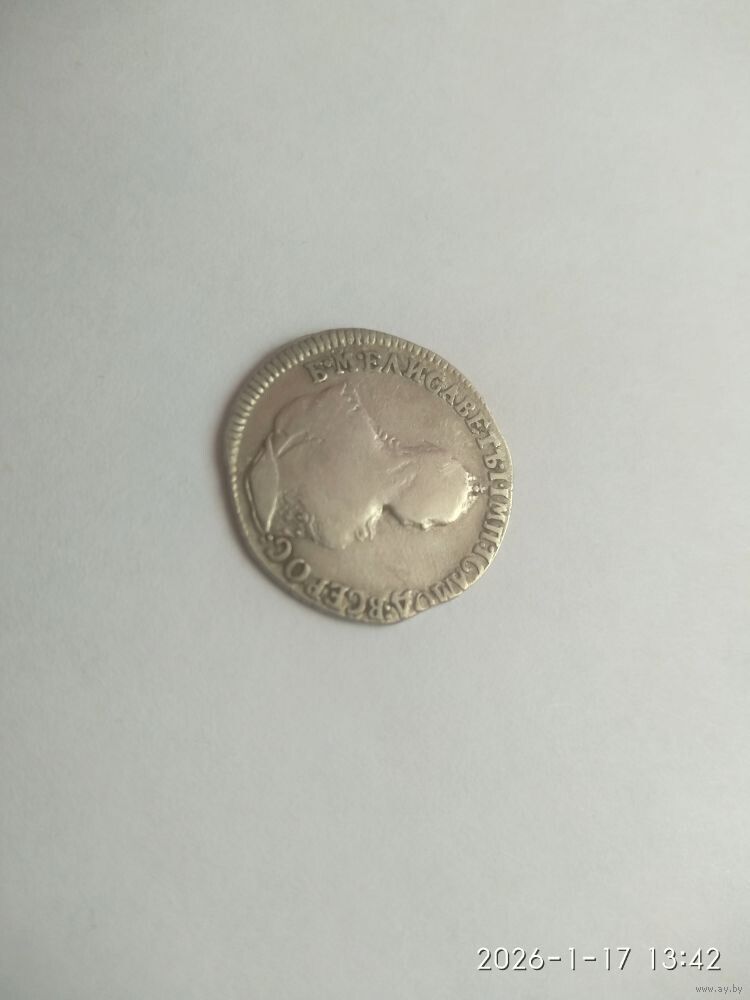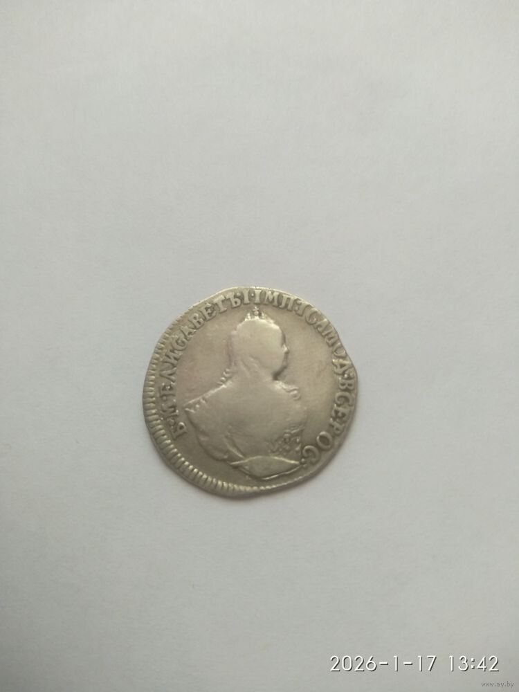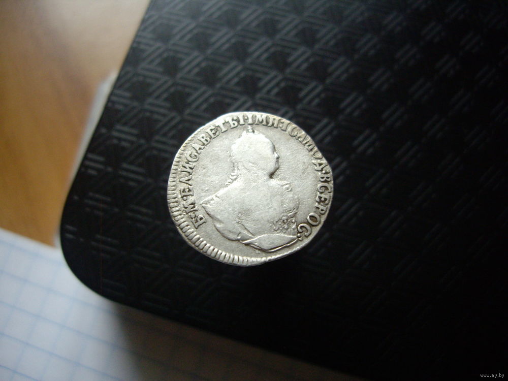 Реверс: Центр аверса занимает правый профиль российской императрицы Елизаветы I Петровны. Слева направо по дуге у края проходит надпись: Б•М•ЕЛИСАВЕТЪ•I•IМП: IСАМОД: ВСЕРОС:
