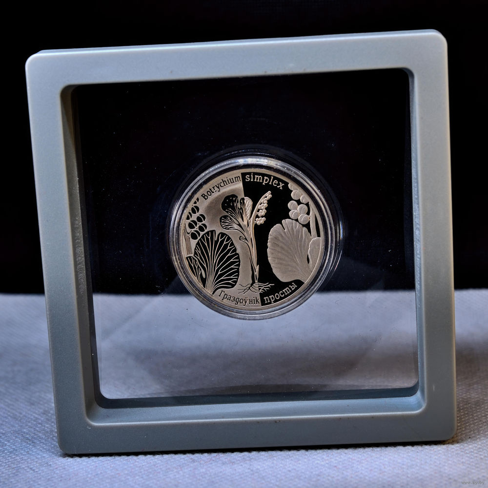 в центре – рельефное декоративное изображение растения гроздовника простого, справа и слева от которого крупным планом расположены фрагменты стебля этого растения с его отличительными признаками; по кругу надписи: вверху – "Botrychium simplex", внизу – "Граздоўнік просты".