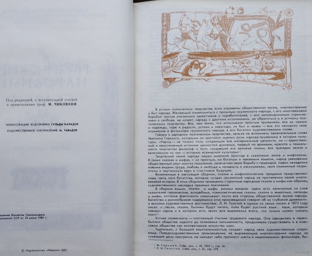 Большой энциклопедический формат. Мелованный альбом. Ляссе. Тираж 2000 экз. 248 стр. В сборнике грузинских народных сказок представлено все богатство и разнообразие художественных сокровищ грузинского народа. Здесь и героические, и волшебные, и бытовые сказки, ярко отражающие культуру, обычаи и традиции грузин, их храбрость, гордость и оптимизм.