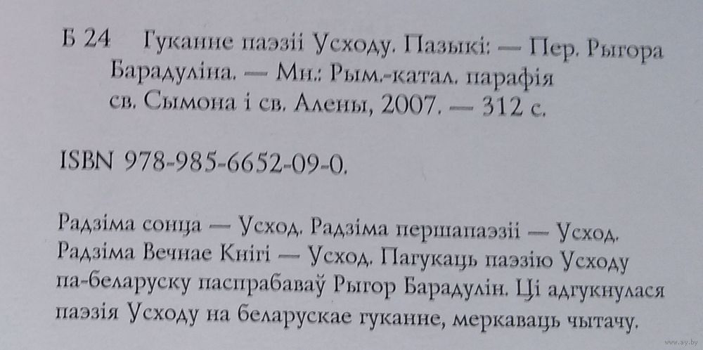 Гуканне паэзіі Усходу: пазыкі. Пераклад Рыгор Барадулін. Мінск : Рымска-каталіцкая парафія св. Сымона і св. Алены, 2007 г. 311 с. Мяккая вокладка.