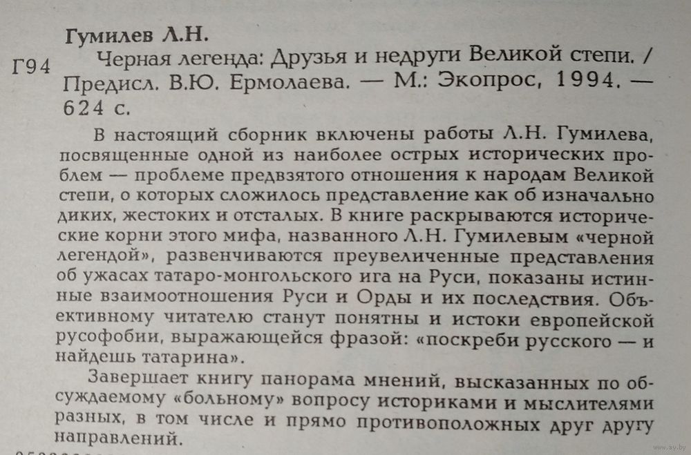 Гумилев Л.Н. Черная легенда. Друзья и недруги Великой степи. Предисловие В.Ю. Ермолаева. Москва. Экопрос. 1994 г. 624 с., илл., карта, твердый переплет, обычный формат.